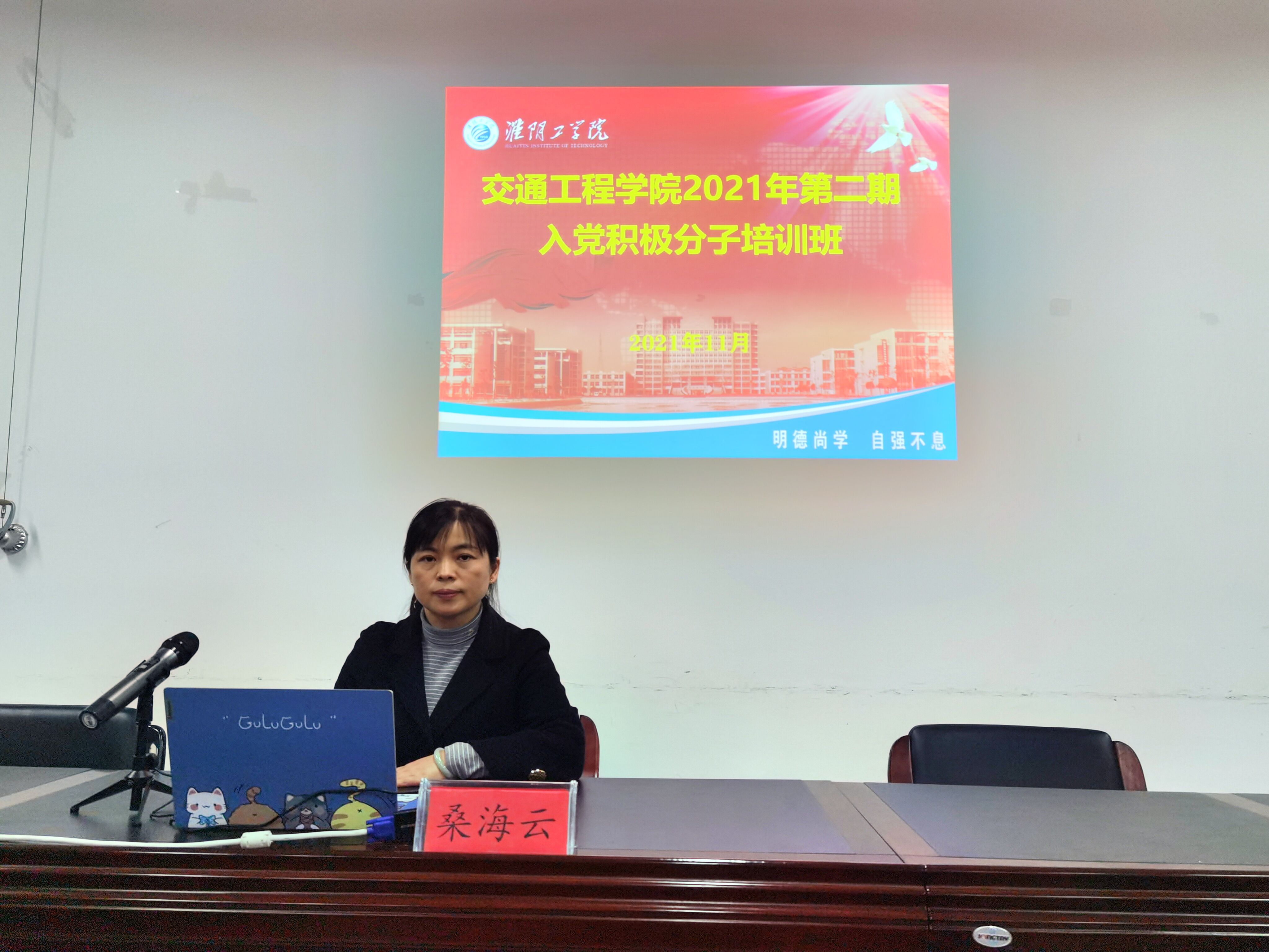 11月18日晚19:00,交通工程学院2021年第二期党课第一讲在24号楼217举行,交通工程学院党委书记桑海云作了《强化意识形态 筑牢思想防线》专题讲座,56名入党积极分子参加学习。