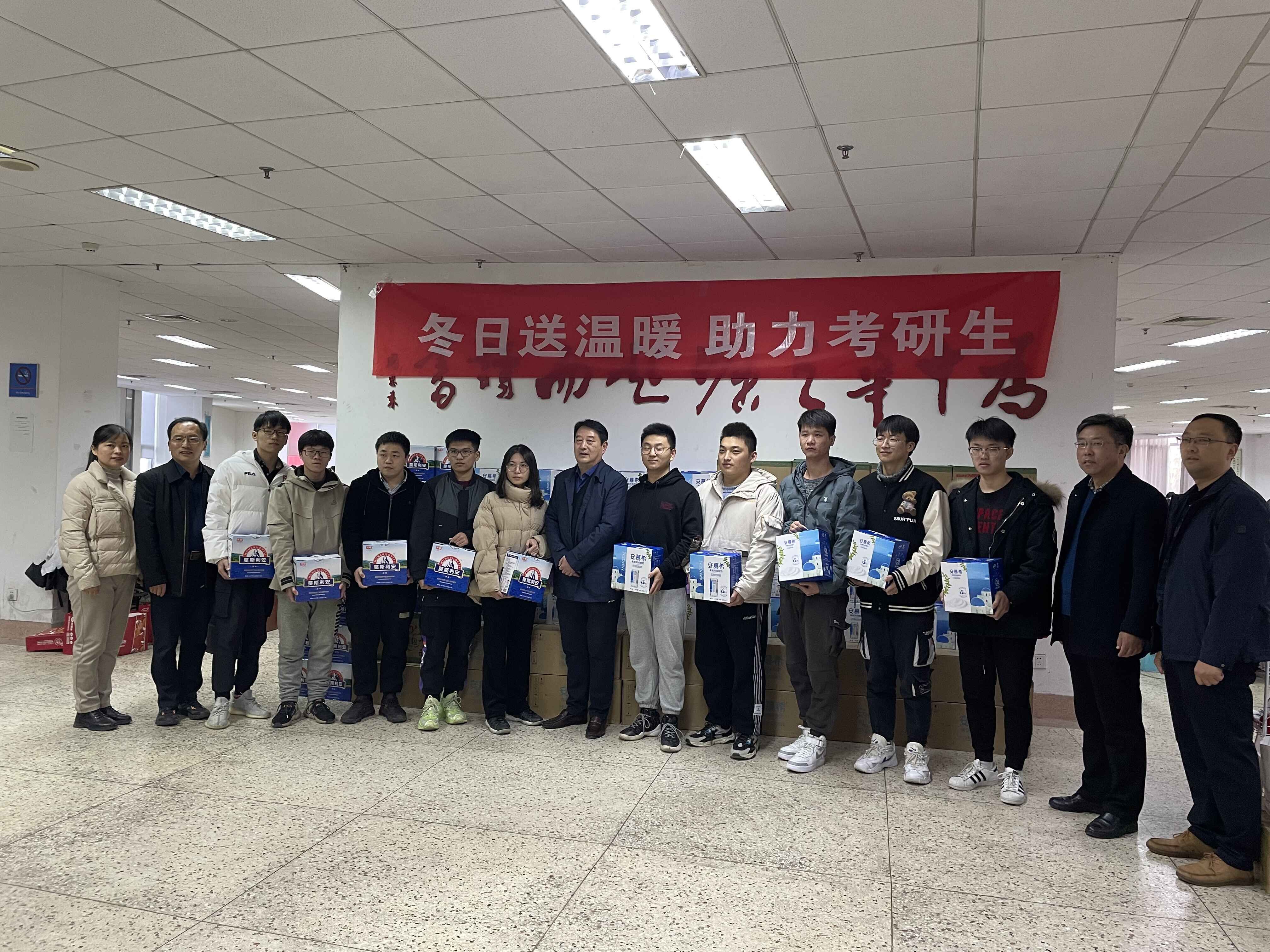 学院领导为每一位考研学子送上一箱酸奶,向考研同学表示慰问。各位领导仔细询问了复习进度以及身体状况,提醒同学注意保暖,劳逸结合,要消除考前紧张、焦虑情绪,保持必胜的心态,如果遇到问题可以向学院寻求帮助,学院会为每一位学子做好服务工作,让同学们能够全身心投入考研冲刺阶段,持之以恒跑完最后的路程。真切的关怀与叮咛温暖了每一位备考学子,他们纷纷表示感受到了学院的关怀,会用优异的成绩回报学院的期待和关心。