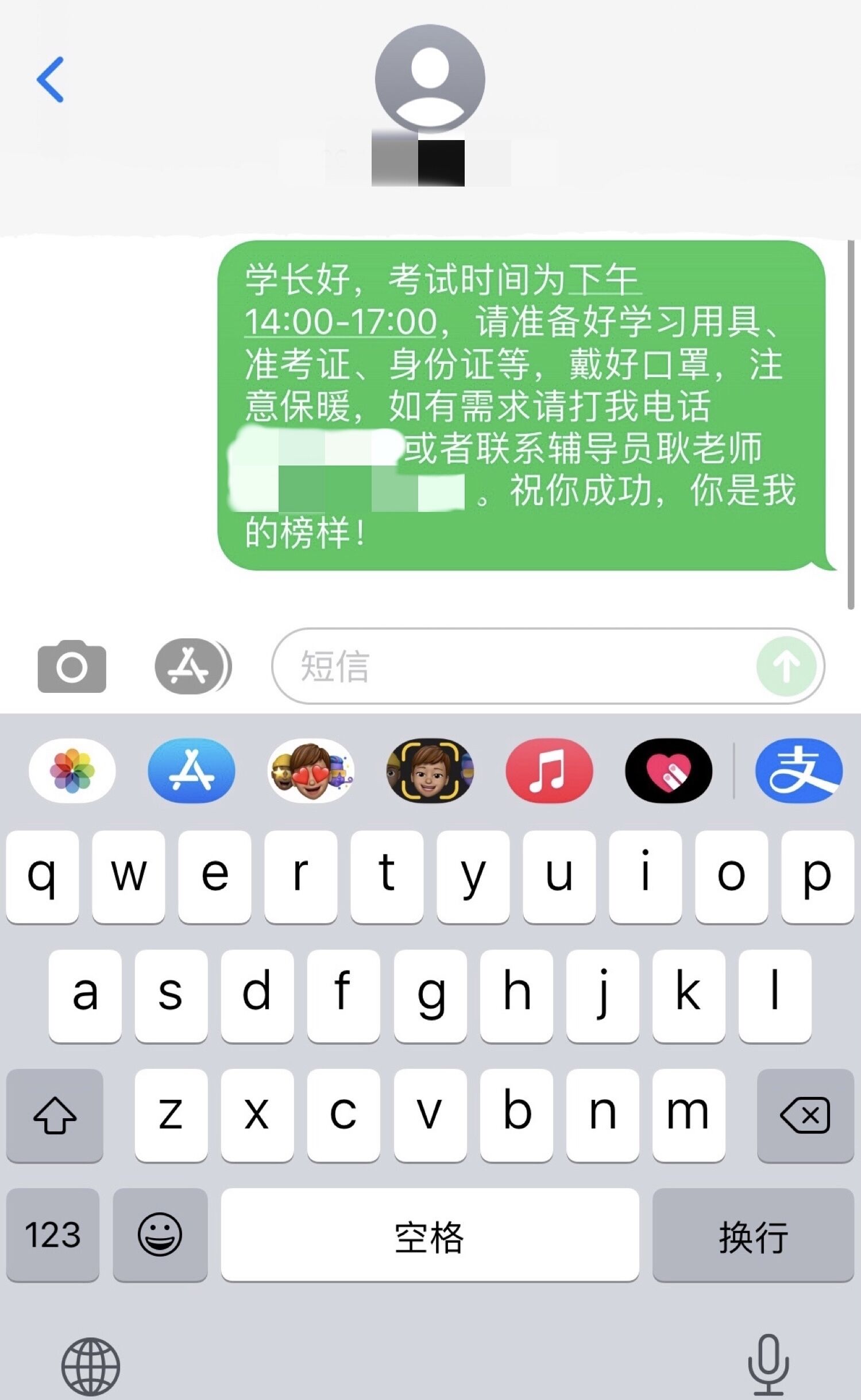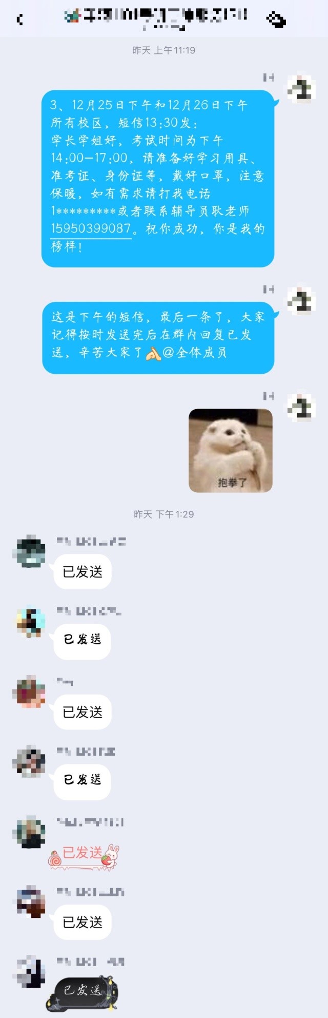 考研期间,志愿者们根据考生的考点,合理安排短信的发送时间。在12月24日之前,主要发送祝福语录,并询问是否需要提前代打饭。在12月25和26日,分别在上下午进入考场前,发送短信提醒考生考试时间、地点、考试工具和接送专车发车时间,并告知考生本人和辅导员的联系电话。他们用朴素而真诚的善意,小心翼翼地呵护着考研人的梦想,争取为考生提供最好的待遇,以便考生们能够排除一切困难,专心应考。