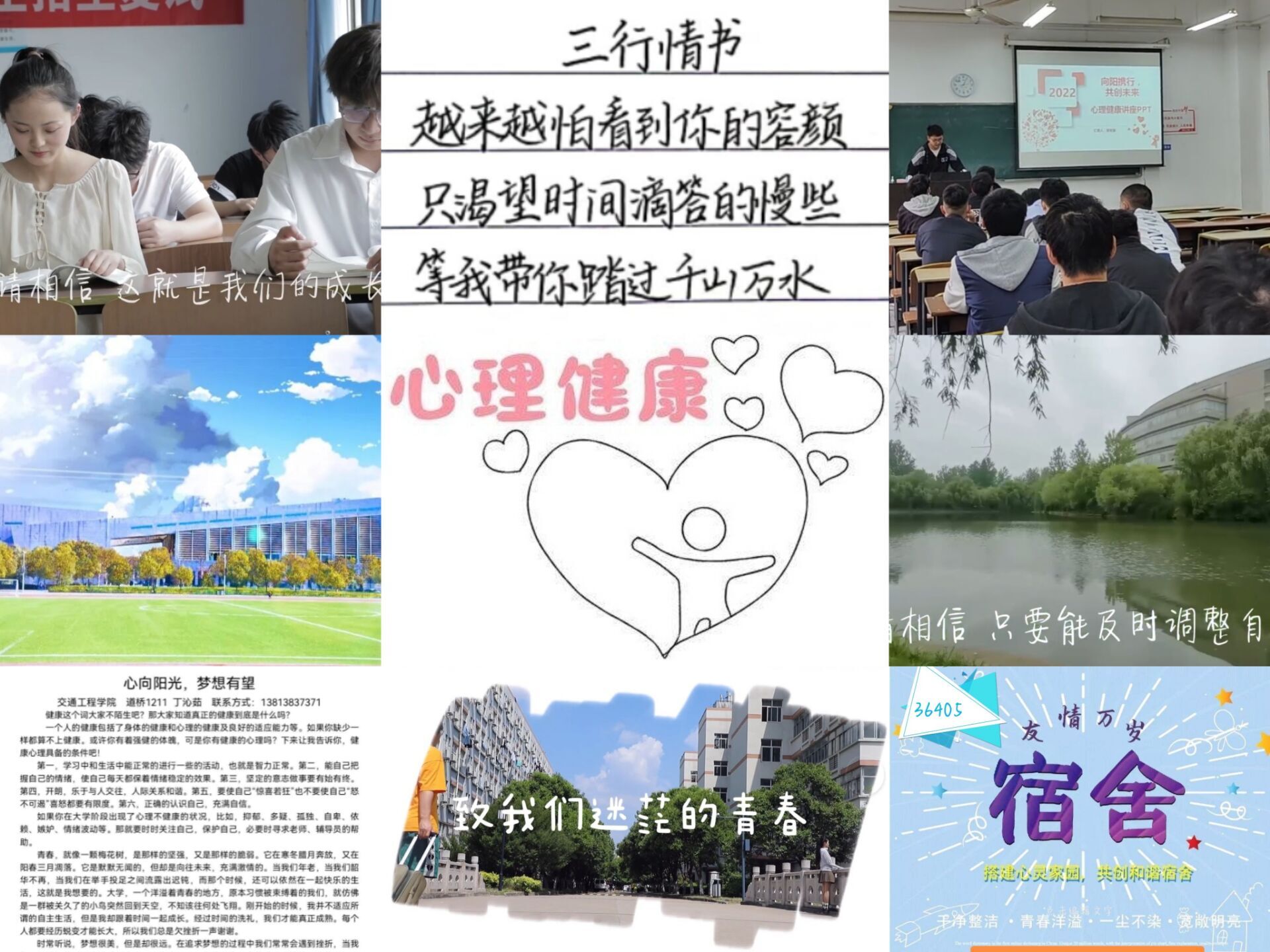 在这一个月中,交通工程学院精心组织,积极策划,从“珍爱生命、心向阳光、砥砺前行、共创未来”理念出发,以培养学生积极向上、理性平和的心态为目标,相继开展了“纸短情长,辞浅情深,三行情书献给您”——母亲节主题活动、壁纸设计大赛、“最美微笑”摄影比赛、心理征文比赛、“寓”见你真好——宿舍海报设计大赛、优秀主题班会评选、“德智体美劳”五育21天打卡活动、心理微电影大赛和朋辈心理素质拓展班班行等一系列丰富多彩、热情洋溢的心理健康教育活动。