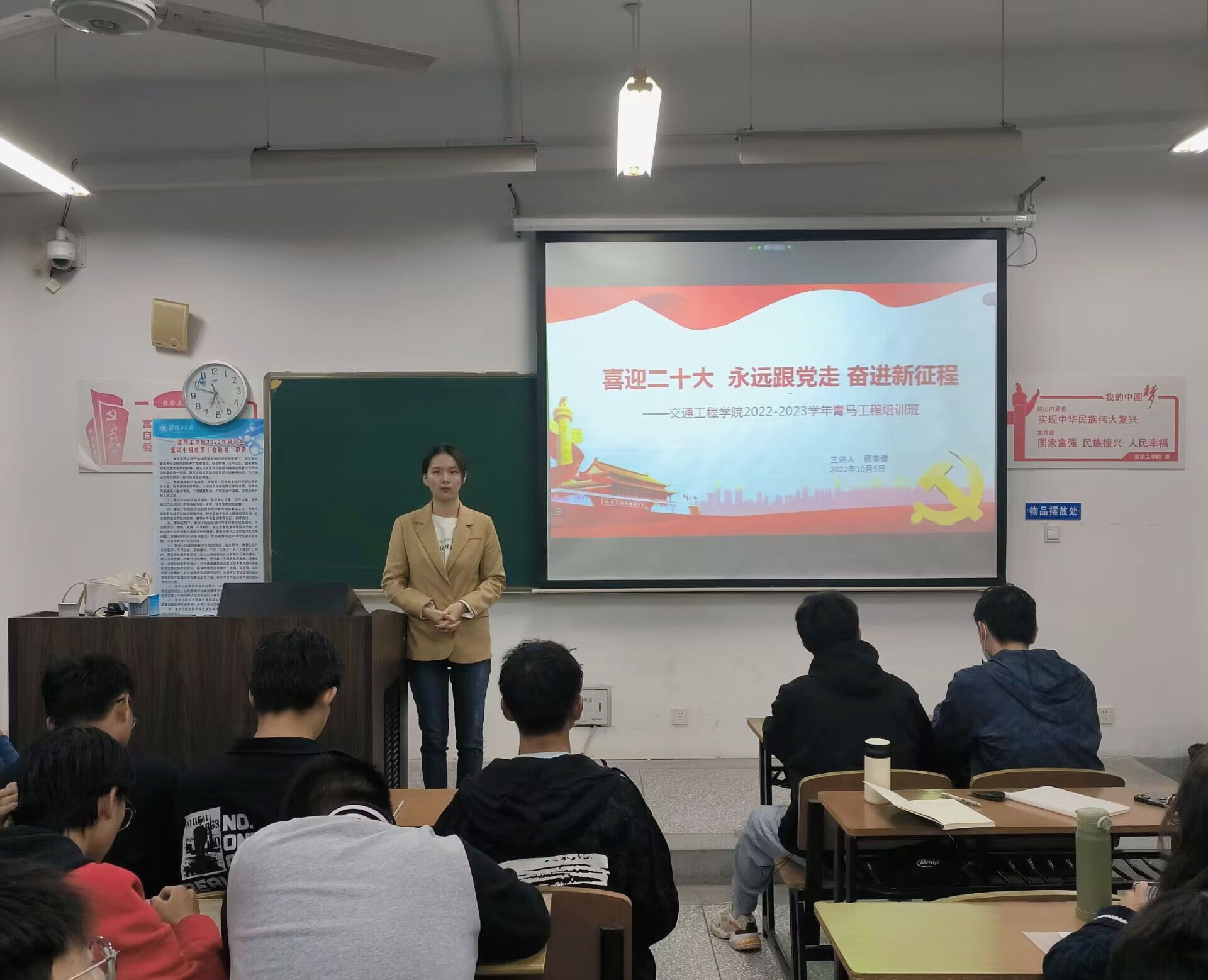 为迎接党的二十大,团结引领广大青年团员坚定信念跟党走、矢志建功新时代,2022年10月5日晚,交通工程学院于线上、线下同步开展了【信仰公开课】——青马工程培训班第三讲:喜迎二十大 永远跟党走 奋进新征程。本次团课由交通工程学院团委副书记顾秉健主讲。