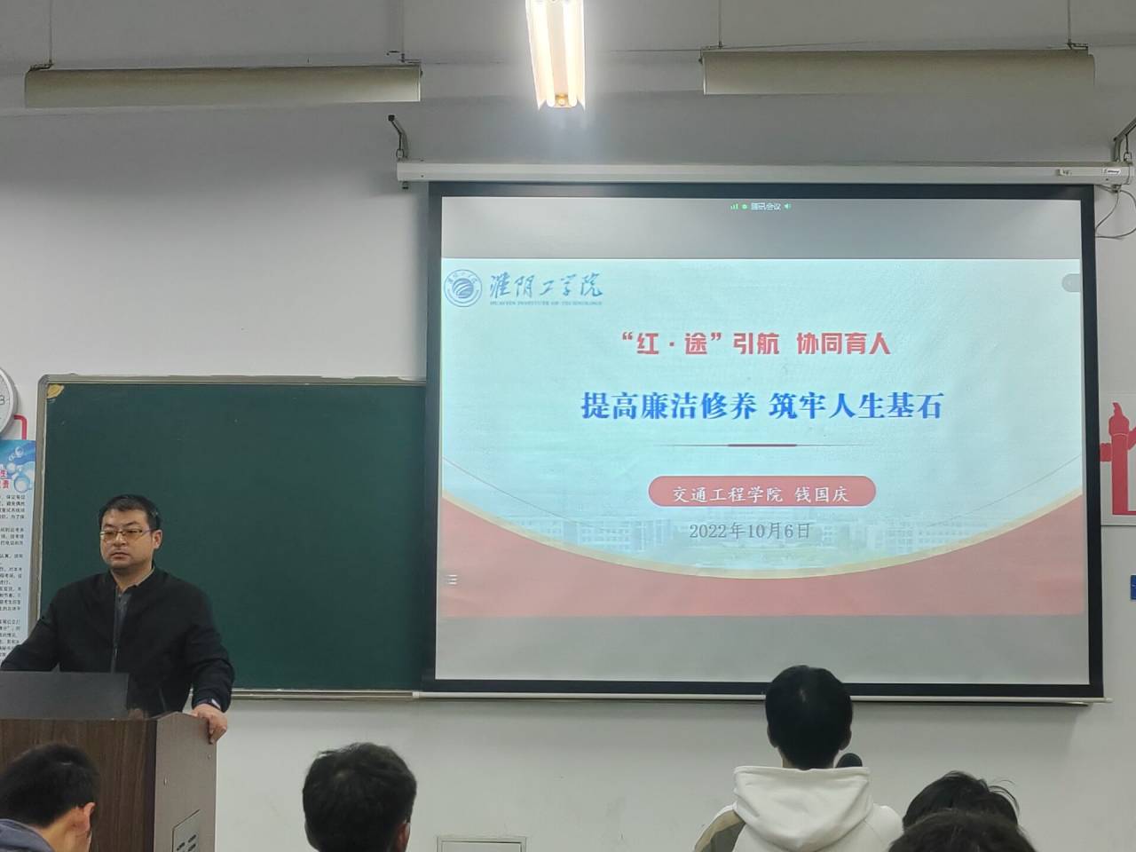 2022年10月6日晚,交通工程学院于线上、线下同步开展了【信仰公开课】——青马工程培训班第四讲:提高廉洁修养 筑牢人生基石。本次团课的主讲人为交通工程学院党委副书记、副院长钱国庆。