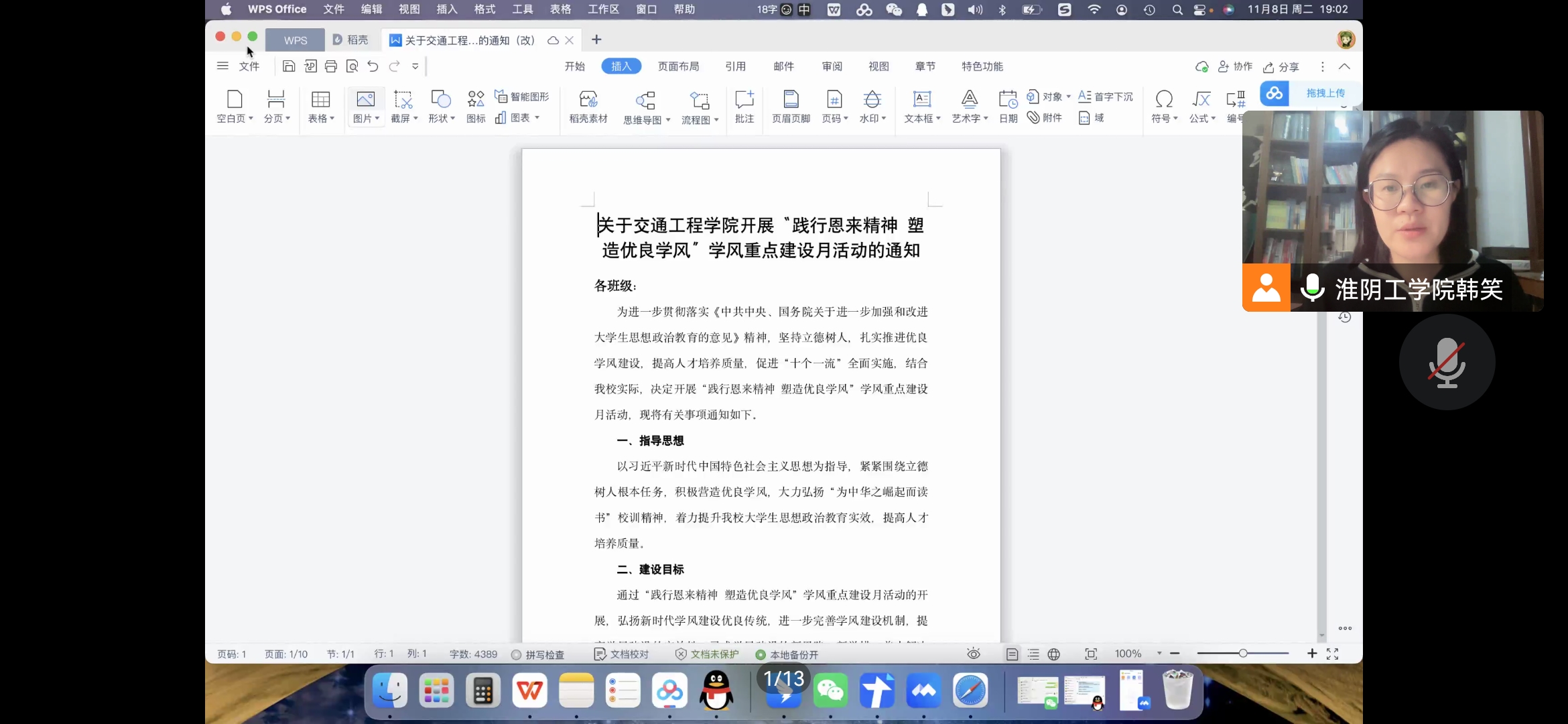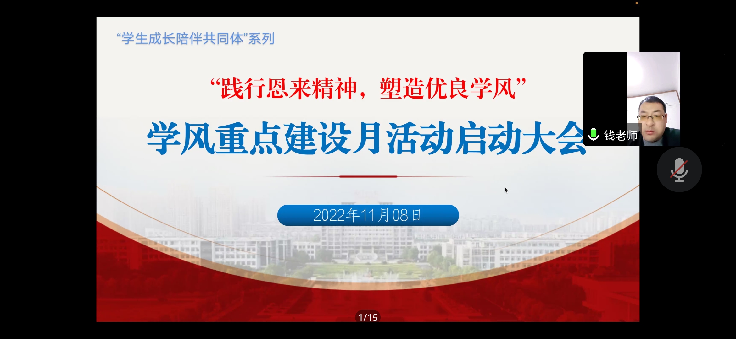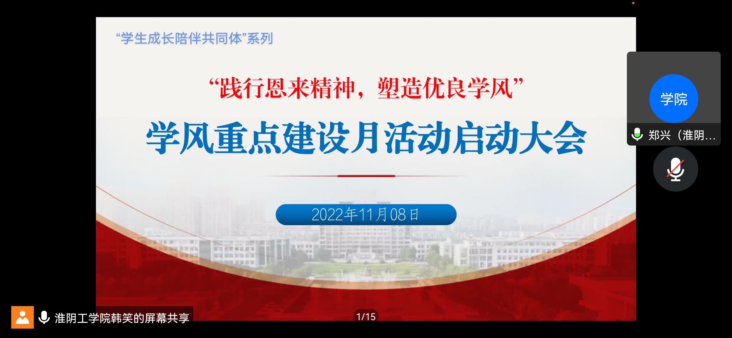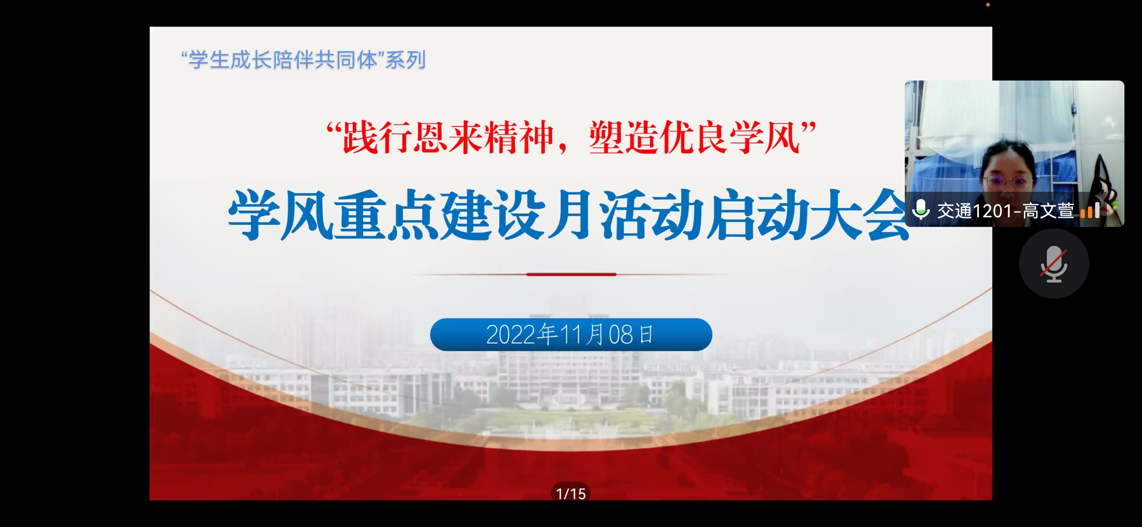2022年11月8日晚,交通工程学院在腾讯会议上召开了“践行恩来精神 塑造优良学风”学风重点建设月活动启动大会,会议由学院学工办主任韩笑主持。
