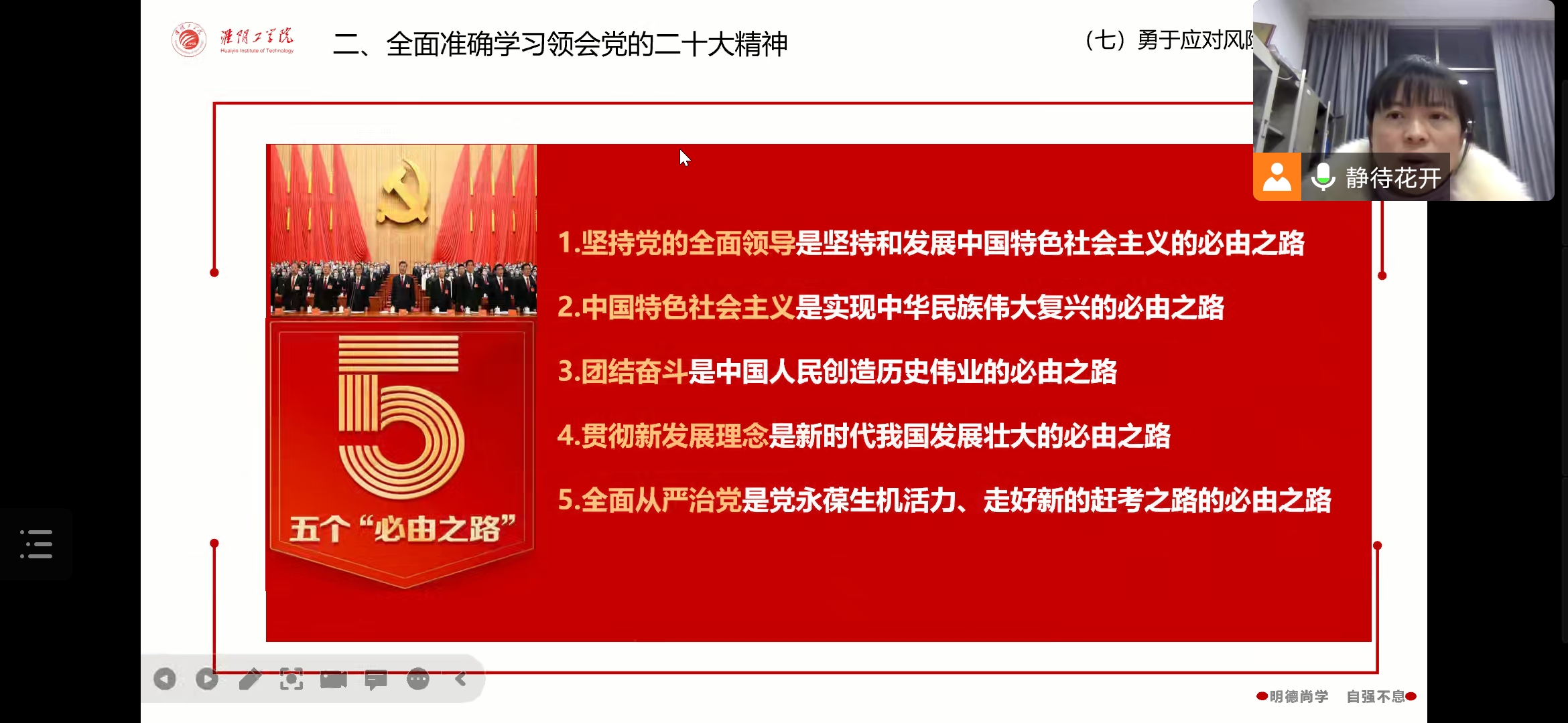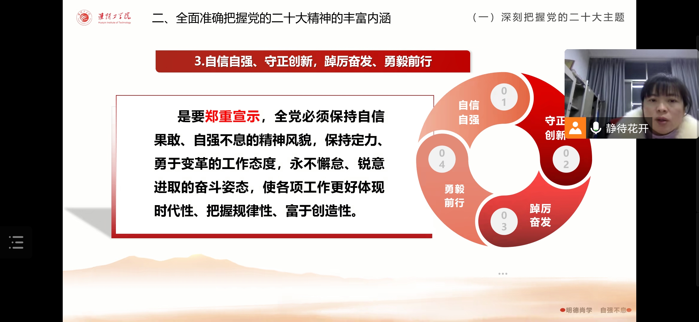 桑海云从“中国共产党第二十次全国代表大会概况”、“全面准确把握党的二十大精神的丰富内涵”和“奋力为教育强省建设贡献淮工力量”三个方面带领大家认真学习党的二十大精神,并要求大家深刻领悟党的二十大精神的丰富内涵。大家纷纷表示要坚定不移地听党话、跟党走,以党的二十大精神为引领,踔厉奋发,努力在新时代新征程上展现新担当、实现新作为。