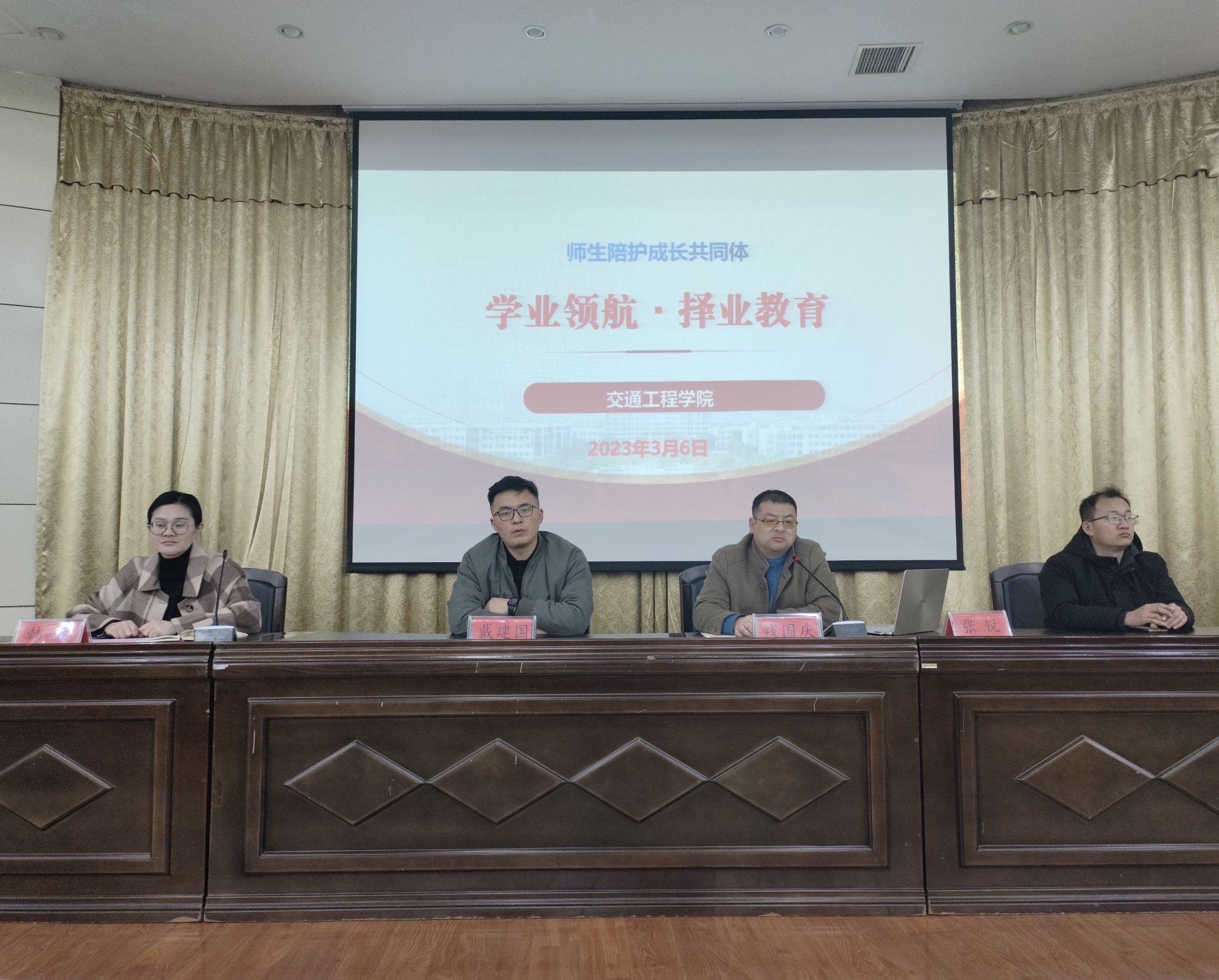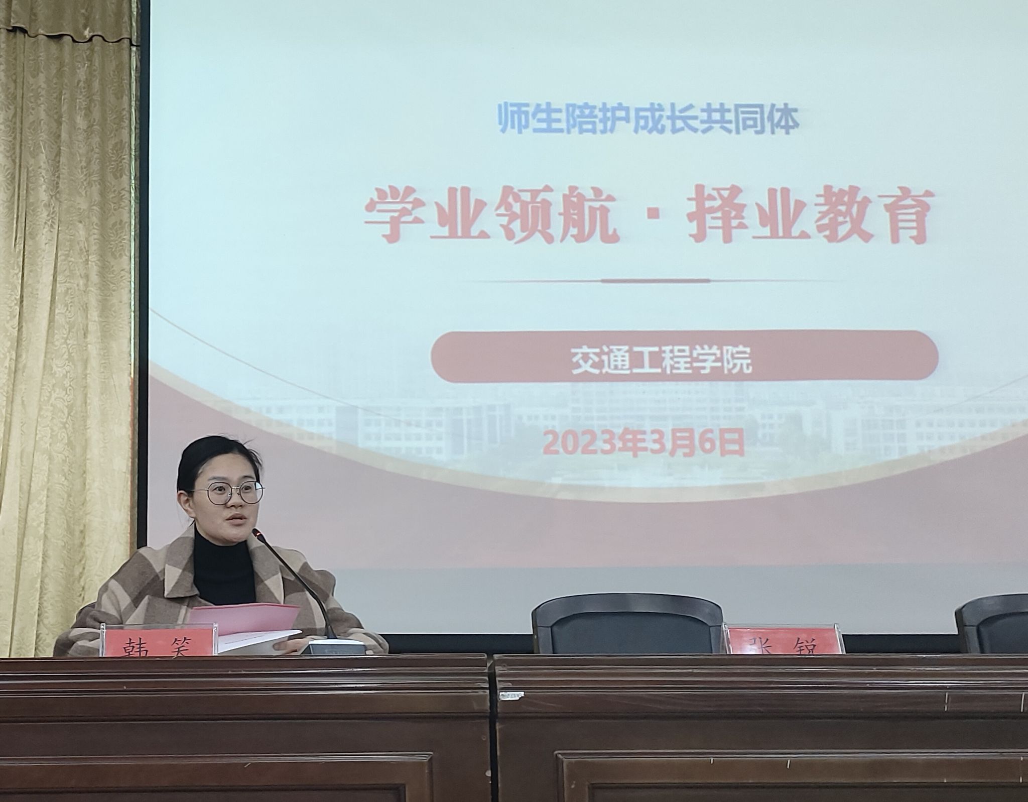 为指导2020级学生做好学业、就业规划,有准备地应对毕业、就业问题,交通工程学院于2023年3月6日晚在图书馆报告厅召开了“学业领航·择业教育”宣讲会,由学工办主任韩笑主持。