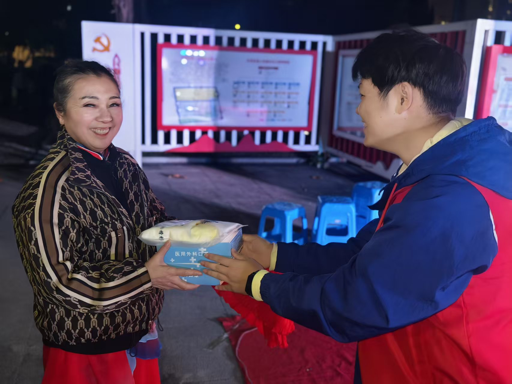 文艺演出进行中,交通工程学院学生党员化身“爱心使者”,为现场居民逐一发放医用外科口罩与暖心慰问品,以实干之举传递真切关怀。他们双手递上物资,轻声叮嘱老年朋友们保重身体、注意防护,一句句暖心问候搭配一份份真挚心意,如秋日暖阳般浸润人心,让居民们的脸上纷纷绽放出幸福灿烂的笑容。