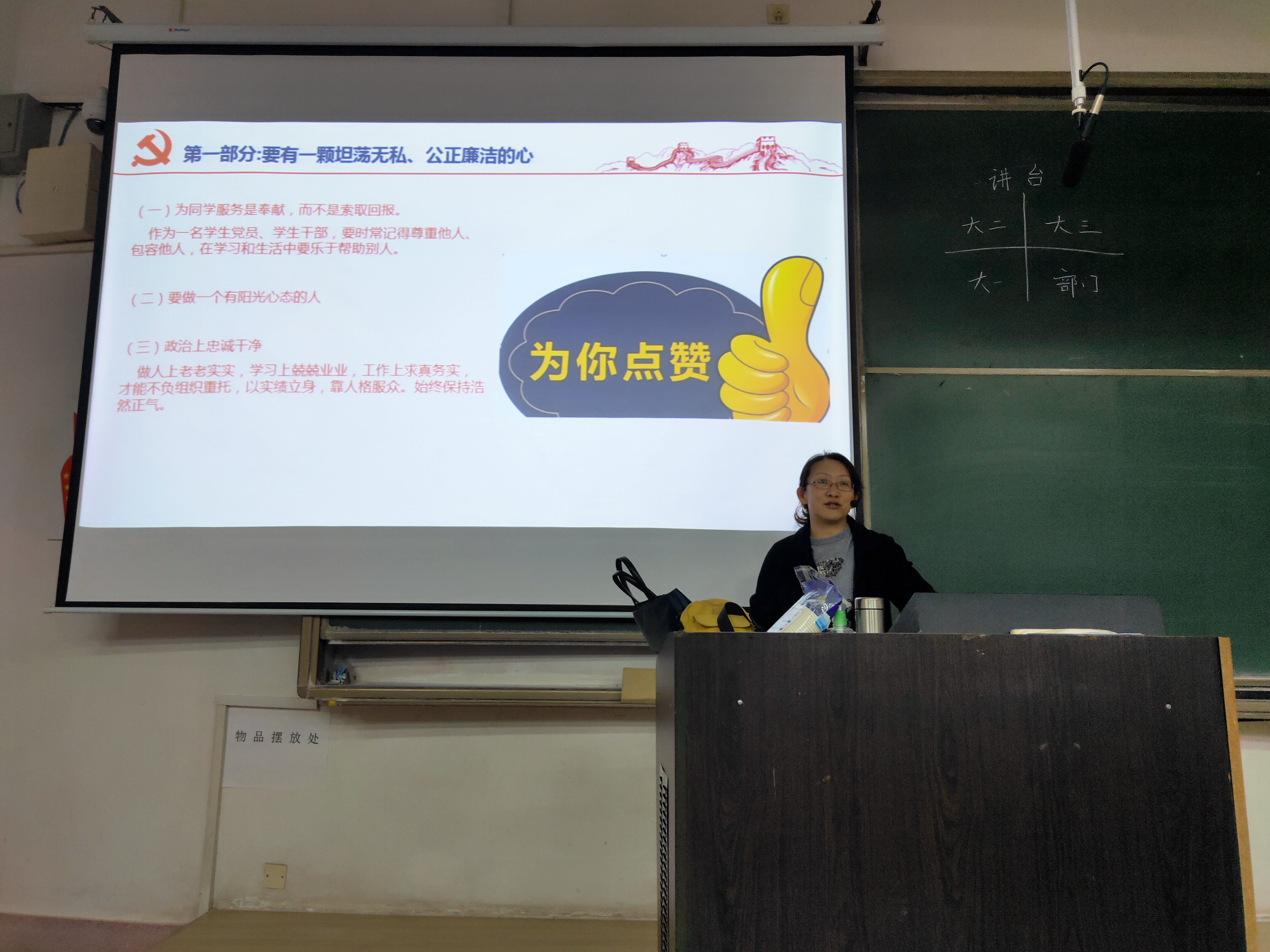 11月12日下午商学院于A阶105成功举办了“战疫情、担使命、扬正气、颂廉洁---党风廉政建设专题党课”本次党课由商学院党委副书记、副院长邓国英主讲。