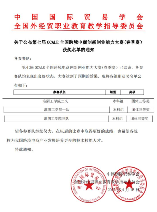 由中国国际贸易学会、全国外经贸职业教育教学指导委员会举办的第七届OCALE全国跨境电商创新创业能力大赛(春季赛)于近日落下帷幕。商学院宋新刚、石卫星、郭世芹、杨健四位老师指导的谈子华、张婷、葛艳艳等9位同学组成的3支学生代表队首次参加该项赛事,均取得了团体三等奖的较好成绩。