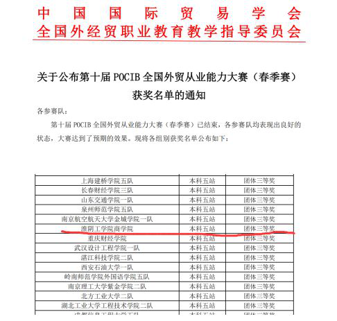 近日,由中国国际贸易学会、全国外经贸职业教育教学指导委员会主办的第十届POCIB 全国外贸从业能力大赛(春季赛)落下帷幕。我校石卫星、陈兆明老师指导的学生团队获《第十届POCIB全国外贸从业能力大赛(春季赛)》团体三等奖,卢春燕同学获个人二等奖,潘甜甜同学获个人三等奖。