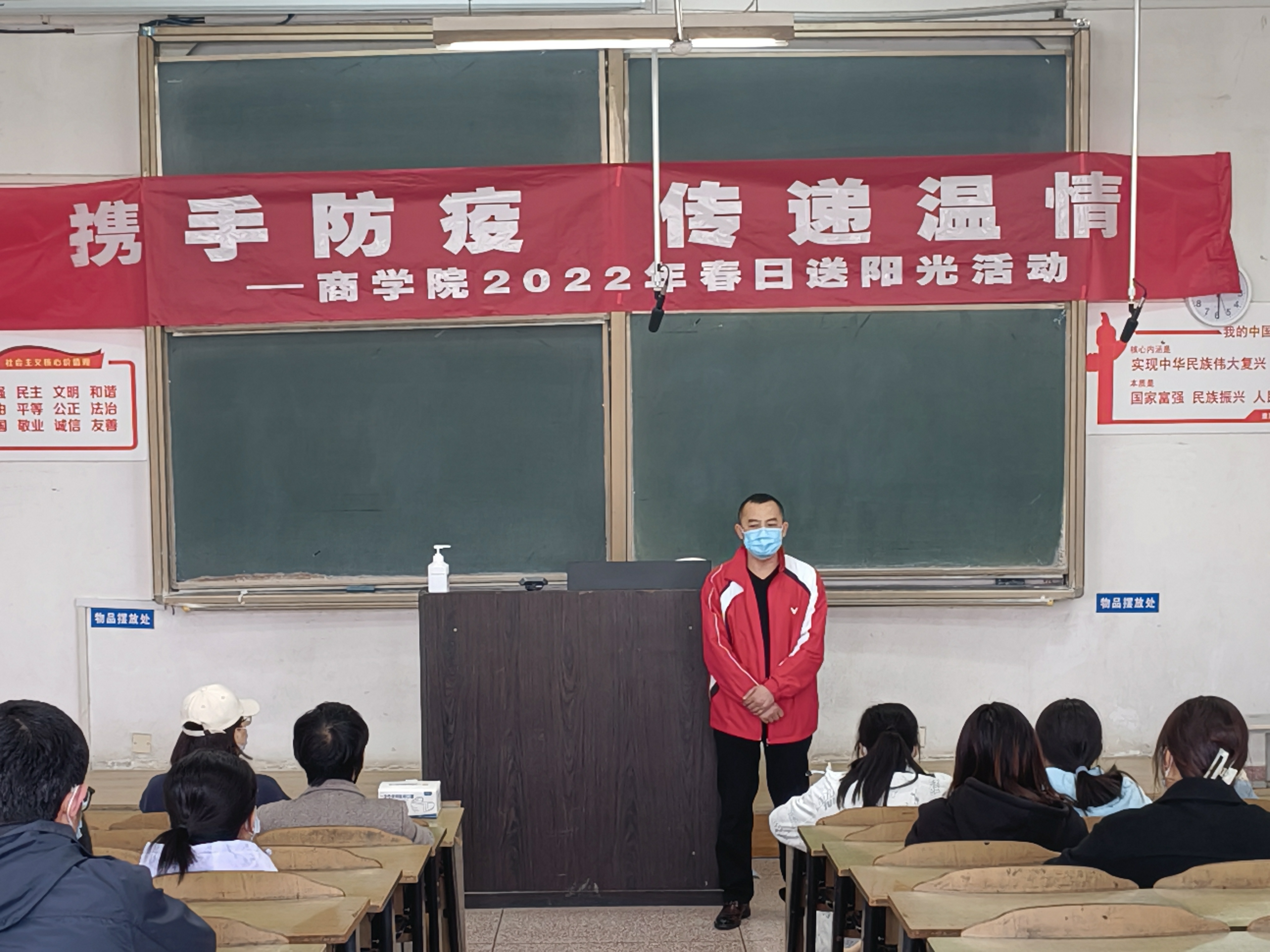 为进一步推动我院资助育人工作的常态化、长效化,帮助我院学习成绩优异的家庭经济困难学生克服困难,拓展素质,树立远大的理想和目标,3月22日中午,商学院于主楼B202教室开展“携手抗疫,传递温情”——2022年春日送阳光活动,切实把学校的关心关爱落到实处。学院党委副书记、副院长杨向阳和全体辅导员老师出席活动,优秀学生代表参加活动。