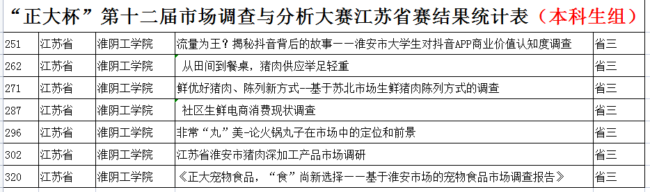第十二届“正大杯”全国大学生市场调查与分析大赛江苏省选拔赛参赛高校包括东南大学、河海大学、江南大学、苏州大学、南京农业大学、中国矿业大学、江苏大学、常州大学、南京财经大学、南京邮电大学、南京信息工程大学、淮阴工学院、淮阴师范学院、盐城工学院等近50所院校,吸引了330多支队伍参赛。大赛纳入江苏省高等教育学会《2021年全省普通高校本专科学科竞赛省级赛事》省级认定赛事。本次省赛采取线上竞赛方式,包括调查报告评价、市场调查路演、PPT展示等环节,团队成员团结协作,沉着应战,高水平发挥,七个项目都获奖。