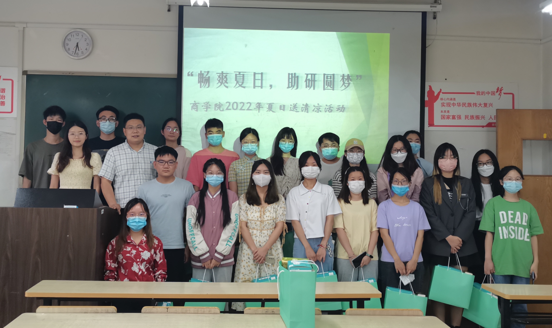 6月8日下午,商学院在尚学楼B107教室开展“畅爽夏日,助研圆梦”2022年夏日送清凉慰问活动。学院党委副书记、副院长郝存生、辅导员老师和部分考研学生代表参加了此次活动。