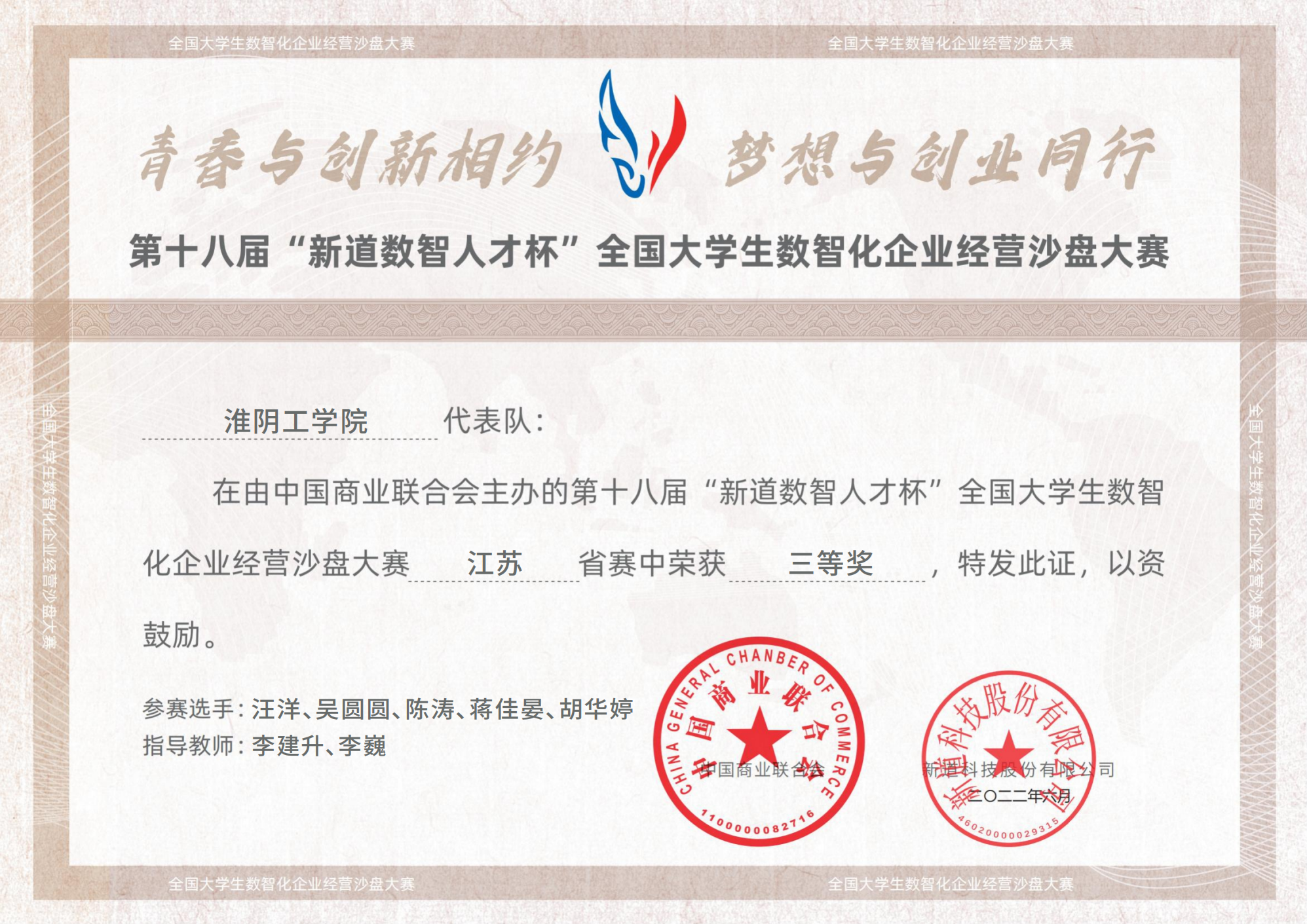 近日,第十八届全国大学生数智化企业经营沙盘大赛江苏省决赛圆满落幕。我院由汪洋、陈涛、胡华婷、吴圆圆、蒋佳晏、张志成、刘欣、火楚珺、吴美珍、蔡江江十位同学组成的两支代表队(指导教师:李建升、李巍)分别获得三等奖。