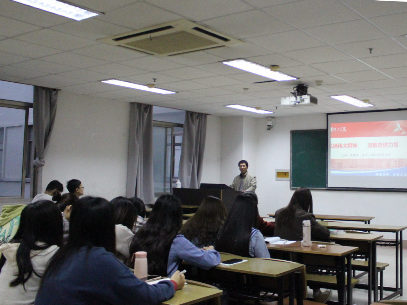 5月19日晚,戚耀贵主讲了党课第一讲,主题为“中国共产党创造的伟大精神”。他介绍了中国共产党在百年发展历程中,形成了独特的革命精神谱系,即革命时期的红船精神,长征精神,抗战精神,建设时期的两弹一星精神与改革时期的抗疫精神。他通过革命先烈的事例讲述了中国共产党当年艰苦的奋斗过程,先烈们心怀祖国,满腔热血,坚定信念,始终把人民放在第一位,才创造了如今伟大的国度。他提出,中国共产党的精神谱系构建了复兴伟业的精神坐标,勉励同学们要体会并传承党的伟大精神,才能在政治思想上有远大追求,成长为优秀的入党积极分子,才能够尽快地加入党组织。