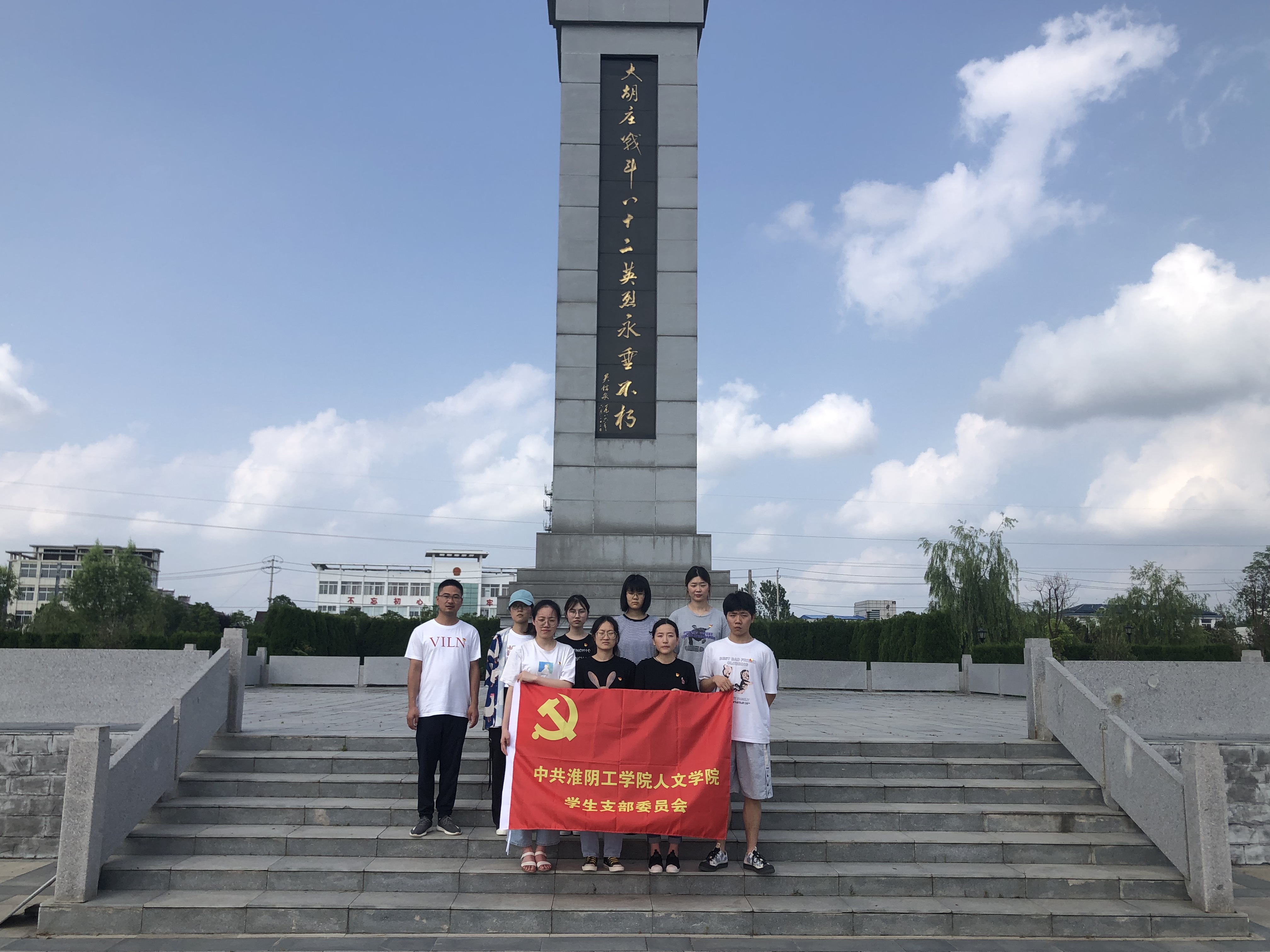 英雄丰碑忠魂铸就,爱国精神代代相传,学生党员怀着庄严肃穆的心情瞻仰了大胡庄战斗烈士纪念碑。为了抵抗日本侵略,争取民族独立,1941年4月26日,新四军三师八旅二十四团一营二连的83名战士,在淮安市淮安区境内的大胡庄,与800多名日伪军激战近10个小时,最终除1人幸存外,其余82人全部壮烈殉国。纪念馆中丰富的照片资料和珍贵的文物史料全面生动地反映出淮安军民在党的领导下用自己的献血和生命谱写的一曲感天动地的爱国主义和革命英雄主义赞歌。党员们缓行、驻足、凝望、深思,深刻感悟共产党人英勇顽强、舍生忘死的牺牲精神和追求理想、追求正义的崇高信念。