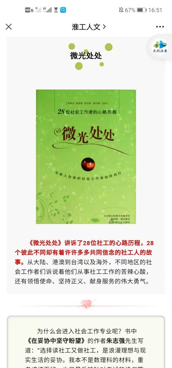 社工1181班徐春洁说:“说实话,选学社工专业,原先感觉这就是一门小学科,没有太大的出息,大一时一直有转专业的念头。后来老师找我谈心,推荐我阅读《微光处处--28位社会工作者的心路历程》。这本书讲述的社工人在专业成长中的经历,对社会工作价值观的体会、对社会工作的专业访问,以及个人与案主交流中的一些故事、社会处境和蕴涵,让我对自己的专业有了全新的认识。社会工作是一项充满着人文关怀的神圣职业,有着“社会的医生、心灵的医生”的美誉。只有学不好的学科,没有干不好的专业。”