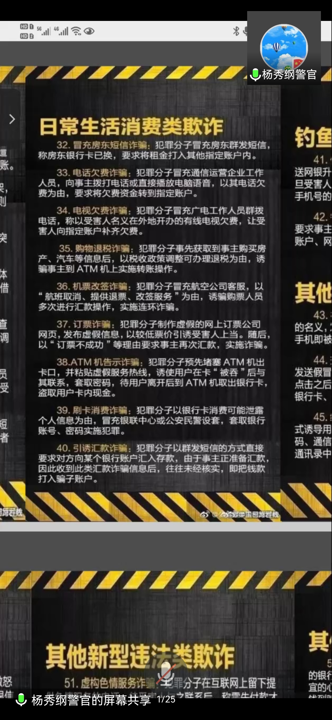 为进一步提高学生识骗、防骗意识和能力,有效防范电信诈骗,人文学院于2022年3月16日晚开展了防范电信网络诈骗专题讲座。本次活动,学院邀请淮安市公安局新城分局福地路派出所民警杨秀纲以线上宣传的方式向21级全体学生和学院主要学生干部宣传防诈常识,讲座由学工办主任时正杰主持。