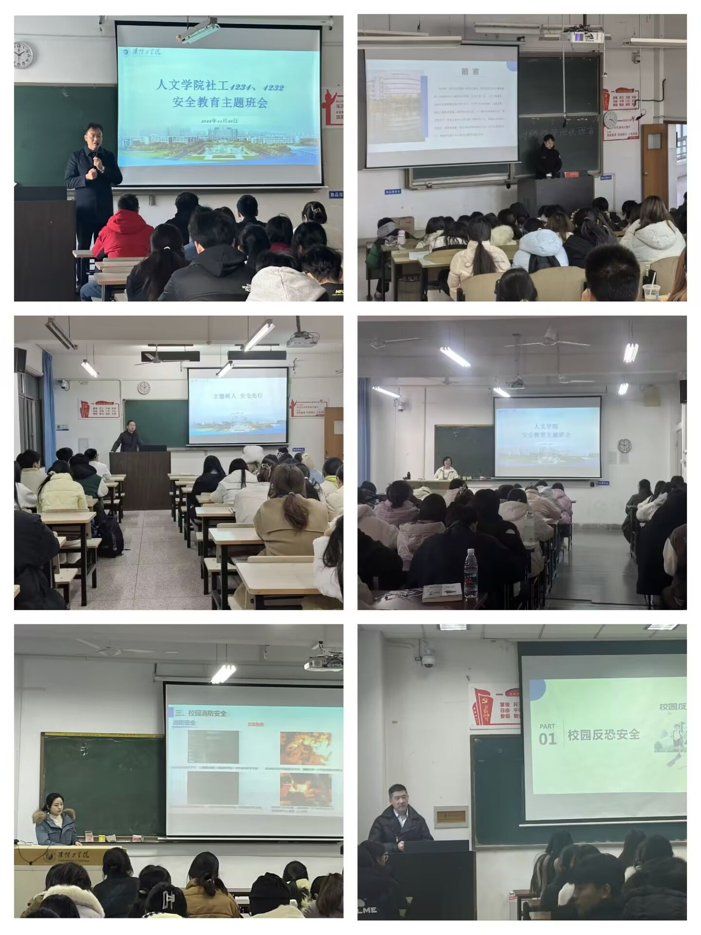 人文学院以班级为单位,围绕校园反恐安全、校园交通安全、校园消防安全、防范电信网络诈骗等方面开展主题教育活动,普及安全知识,提高同学们的安全防范意识。督促同学们严格遵守学校安全管理要求,自觉开展安全隐患自查,并发动班级学生骨干,开展不定期的安全检查,切实筑牢安全防线。