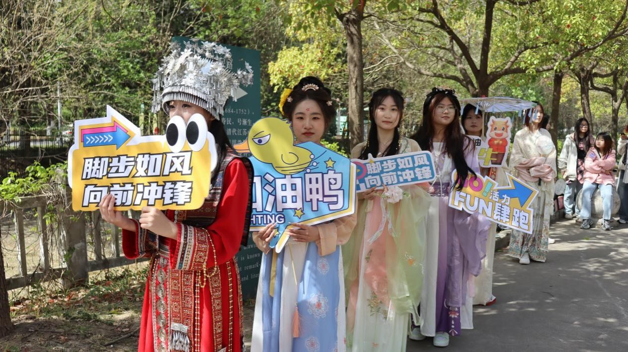 人文学子身着少数民族传统服饰,迈着自信的步伐依次走过,舞剑表演者身着传统服饰,手持长剑,剑随身动,为马拉松选手加油打气。