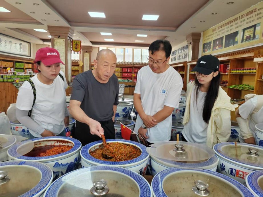 7月22日上午,探寻团步行至万盛园酱菜博物馆,拜访潼关酱菜第六代传承人宋岗山。先后参观了潼关万盛园酱菜博物馆和酱菜非遗展示馆。馆内的百年酱缸、传统腌制工具静静陈列,无声诉说着这项技艺的悠久历史。宋岗山结合展品讲述酱菜里的民俗故事,他强调:“传统不能守旧,要在创新中求存,让年轻人真正了解老手艺里的文化内涵。”