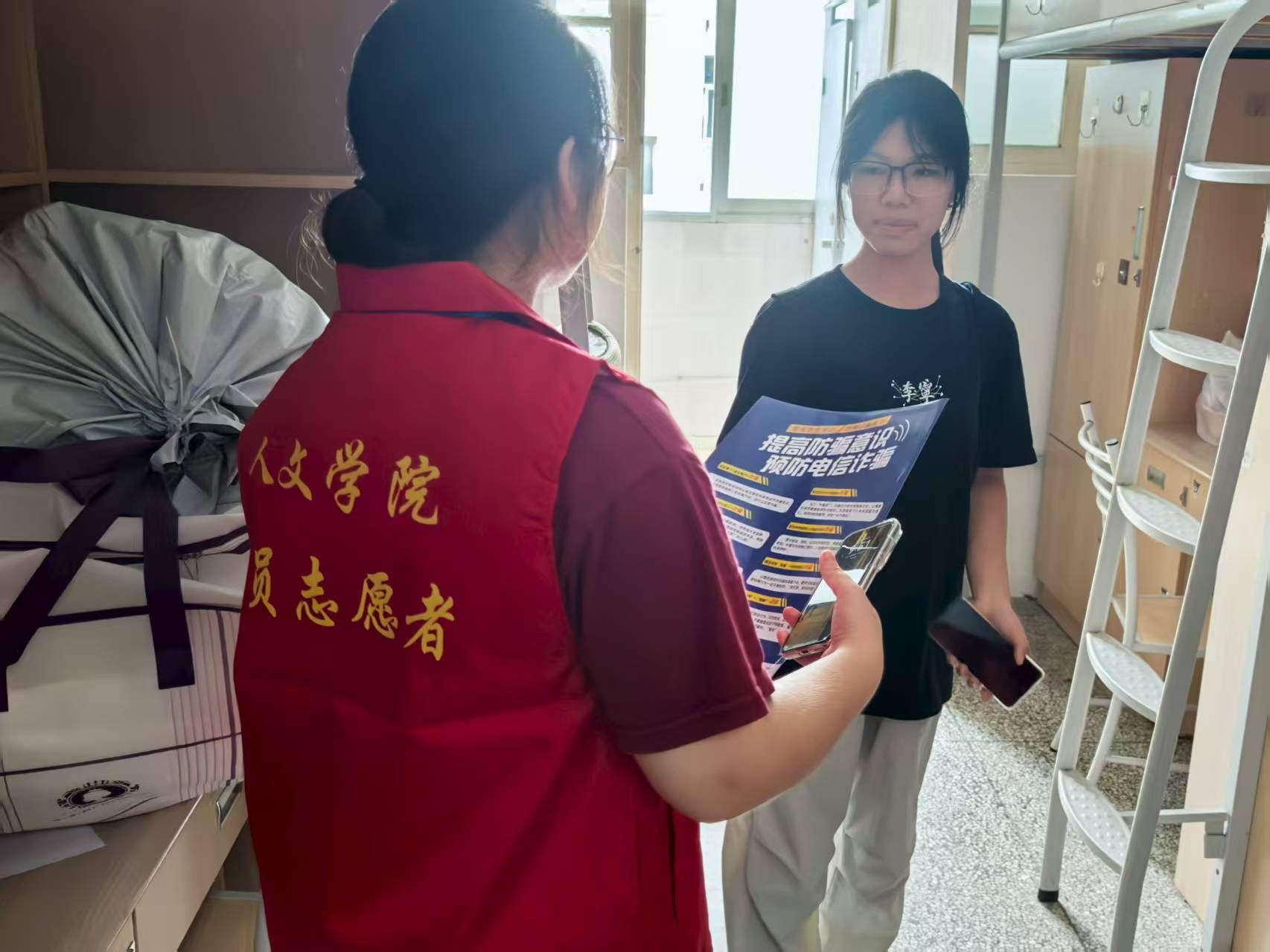 为了更好地了解新生的适应情况,党员志愿者跟随辅导员老师走访了学生宿舍与新生们进行了亲切的交流和互动。志愿者们分享了自己的学习经验和大学生活心得,对新生开展了反诈宣传,提醒每位新生谨防电信诈骗,守护好自己的“钱袋子”;同时对新生关于入党流程的问题做出详细的解答,鼓励新生们要勇敢面对挑战,积极融入新的学习环境,在大学期间努力学习,积极向党组织靠拢。在轻松愉快的氛围中,新生们逐渐消除了初来乍到的陌生感和紧张感。