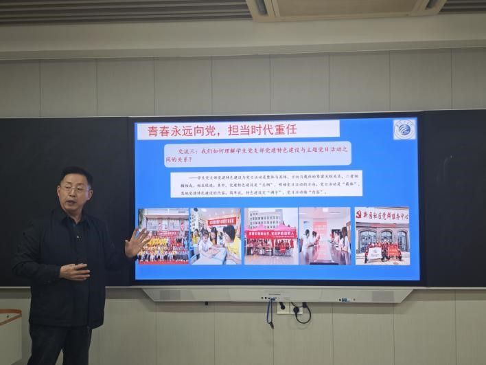 首先,许东风以“青春永远向上,担当时代重任”为核心主题,围绕“党建特色与主题党日融合路径”展开交流,聚焦学生党支部党建特色品牌化建设,提出应结合人文社科的专业特点打造如“一米阳光志愿队”等具有创新性、实效性、连续性的党建项目。他强调,党建品牌化建设需立足“常规工作是基础、特色建设是提升”的原则,以统一主题引领主题党日活动,避免内容发散,同时要回应学生党员的学业、职业发展需求,杜绝短期行为与形式主义,系统谋划长期发展。