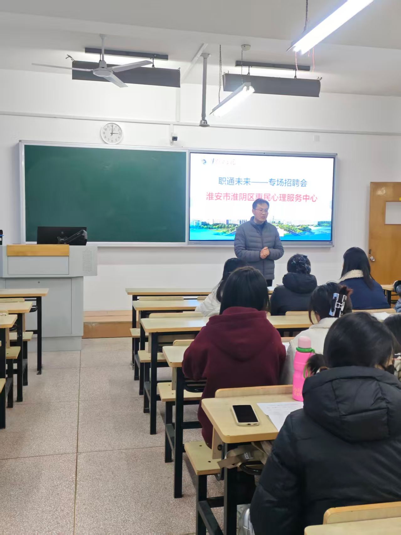 招聘现场气氛热烈而有序,淮安市淮阴区惠民心理服务中心创始人兼招聘负责人张玉芹校友,带着对母校的深厚情谊和对学弟学妹的殷切期望亲临现场。她通过精心制作的PPT、企业宣传片等多元形式,生动讲述了自己从学校毕业后的创业历程,分享了惠民心理服务中心从初创到发展为区域知名心理服务机构的成长故事,让在场毕业生深切感受到校友奋斗的力量与人文精神的传承。