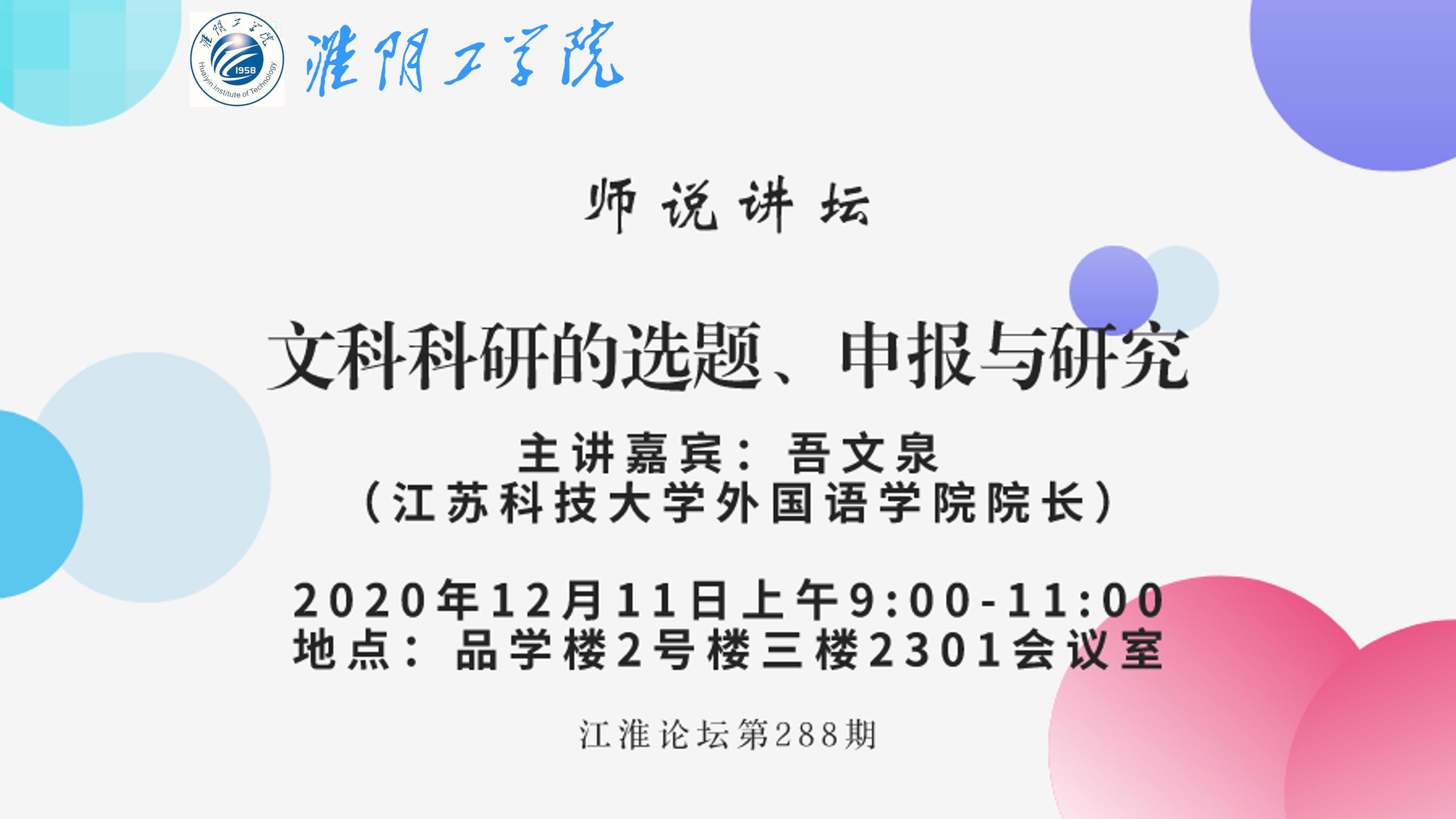 2020年12月11日上午,江苏科技大学外国语学院院长吾文泉教授应邀为淮阴工学院“江淮论坛”(第288期)和外国语学院“师说讲坛”做题为《文科科研的选题、申报与研究》的学术讲座。淮阴工学院外国语学院院长左进教授主持此次讲座,学院从事外语教学或有志申报课题的老师参加。