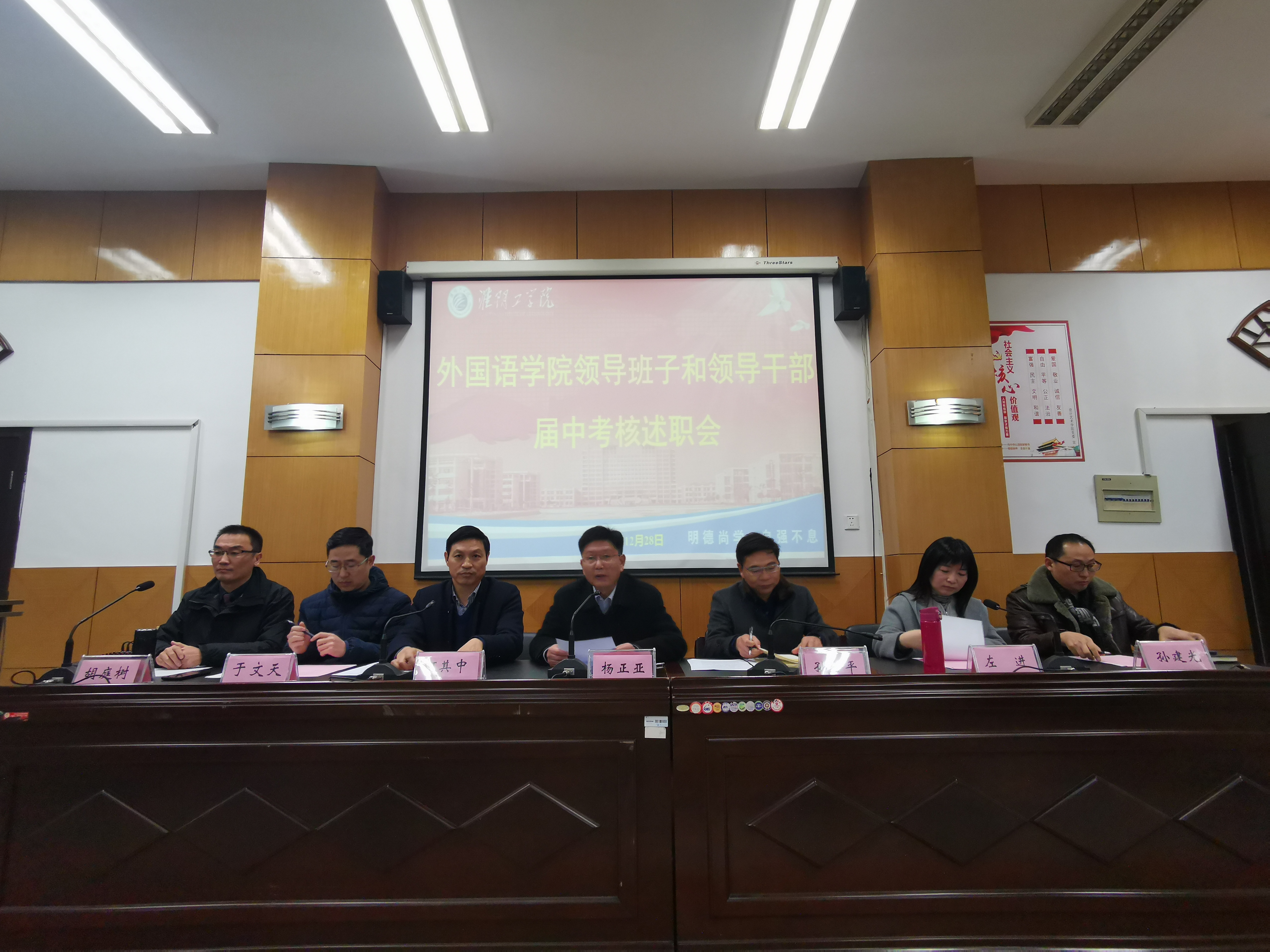 12月28日下午,外国语学院在品学楼2210报告厅召开领导班子和领导干部届中考核述职会,校党委常委、副校长杨正亚、党委教师工作部、人事处处长孙全平、人事处劳资科副科长顾婧、外国语学院全体教师出席会议,会议由外国语学院党委书记何其中主持。
