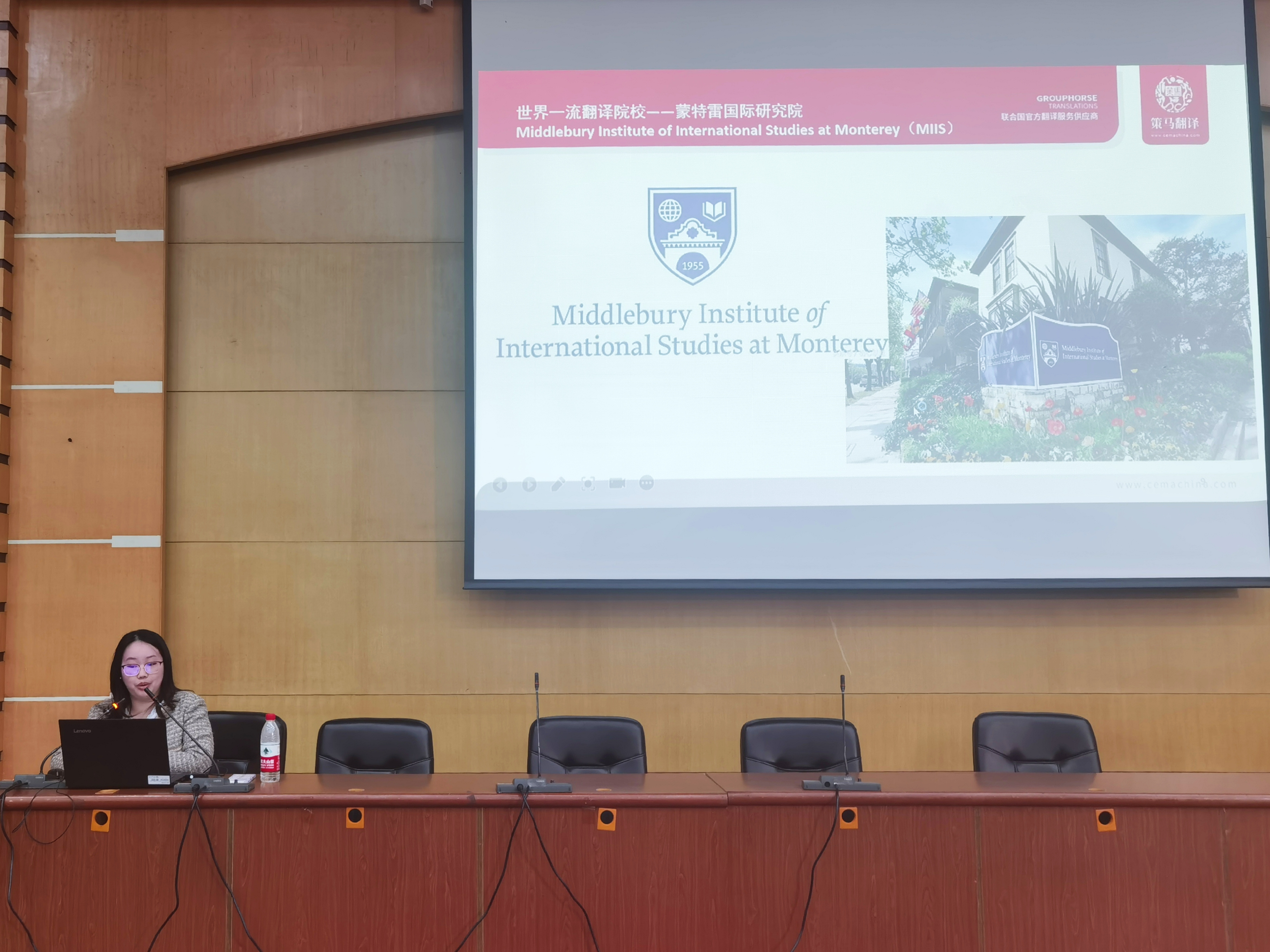 活动伊始,李靖琳女士分享了自己大学四年的经历,其曾在大一学期初次接触并成功考取CATTI,大二学期参加了多项中外交流活动,于大三时通过英语演讲比赛走上翻译之路。接着,李靖琳女士向同学们展示了在蒙特雷的求学之旅和在外交部的日常生活。随后,又和同学们交流了自己的翻译心得:首先要学会自我调整状态;再者,在不断自主学习的同时,要明白翻译不只是翻译。
