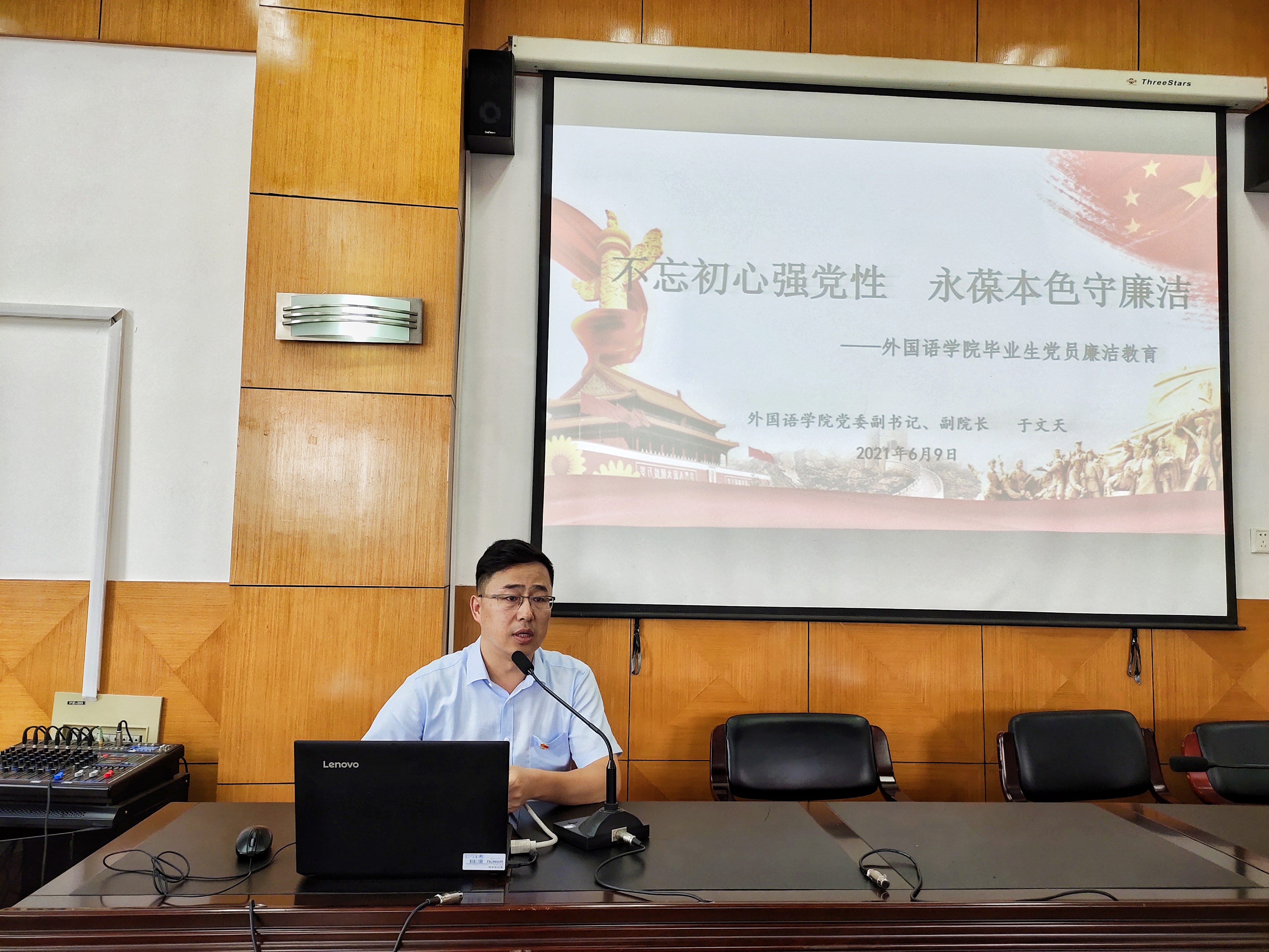 为加强毕业生党员廉洁教育,2021年6月9日14:00外国语学院于品学楼2210召开“不忘初心强党性,永葆本色守廉洁”主题会议。本次会议由党委副书记、副院长于文天主持,第五党支部书记夏芸和全体毕业生党员参与。