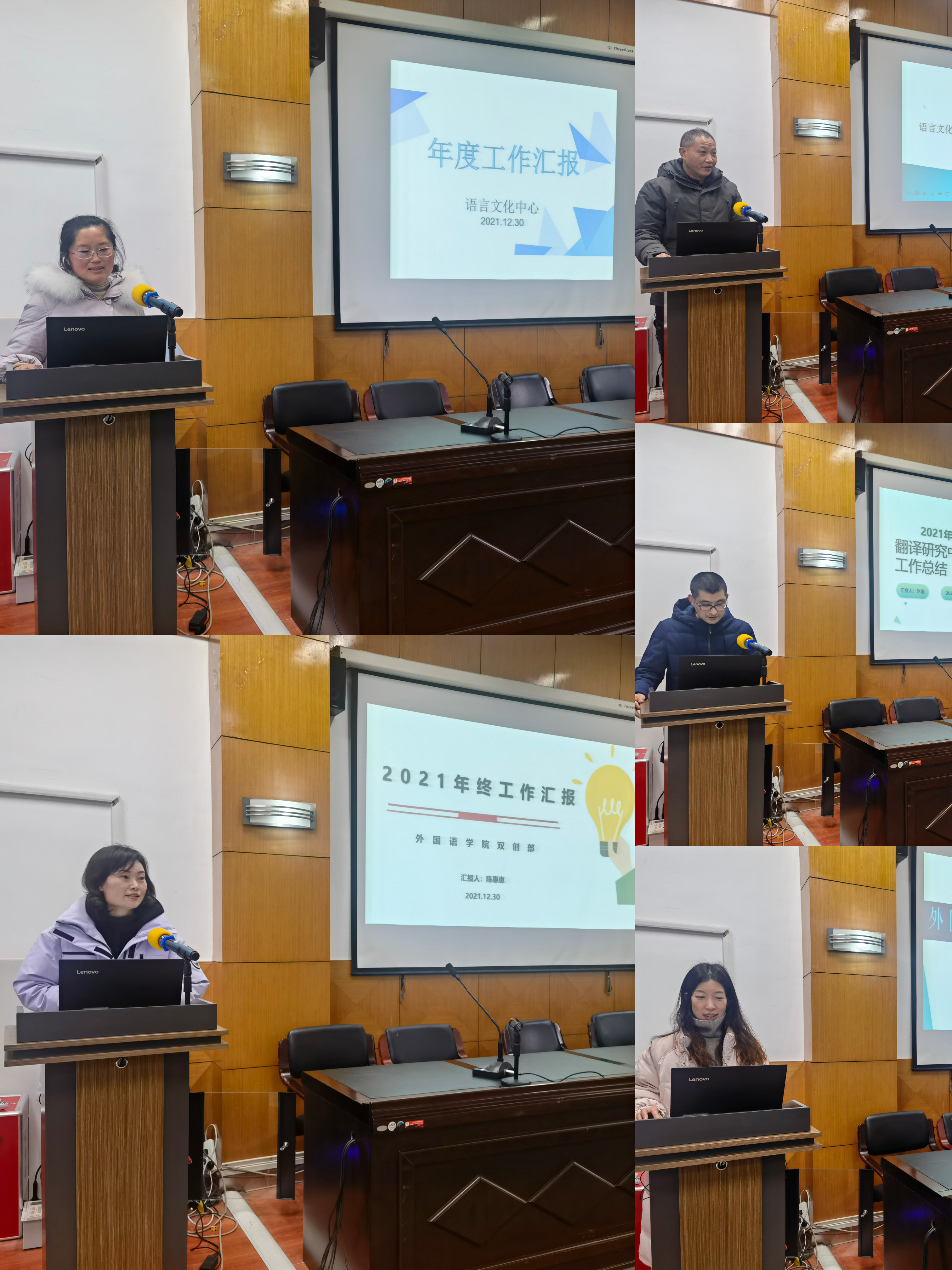 大学英语教学部主任马星宇、英语系主任薄婷、商务英语系主任裘莹莹、翻译系主任李梓、俄语系副主任闫静、研究生教学部于敏、语言文化培训中心主任王春梅、“双创”部主任陈惠惠、语言文化研究中心宋振军和翻译研究中心副主任赵磊等10位内设机构负责人分别从教学任务、专业建设、教学质量、教学管理、实践教学、科学研究和2022年工作计划等几个方面进行了工作汇报,交流创新作法,总结成绩、分享经验、查摆问题,提出整改措施。