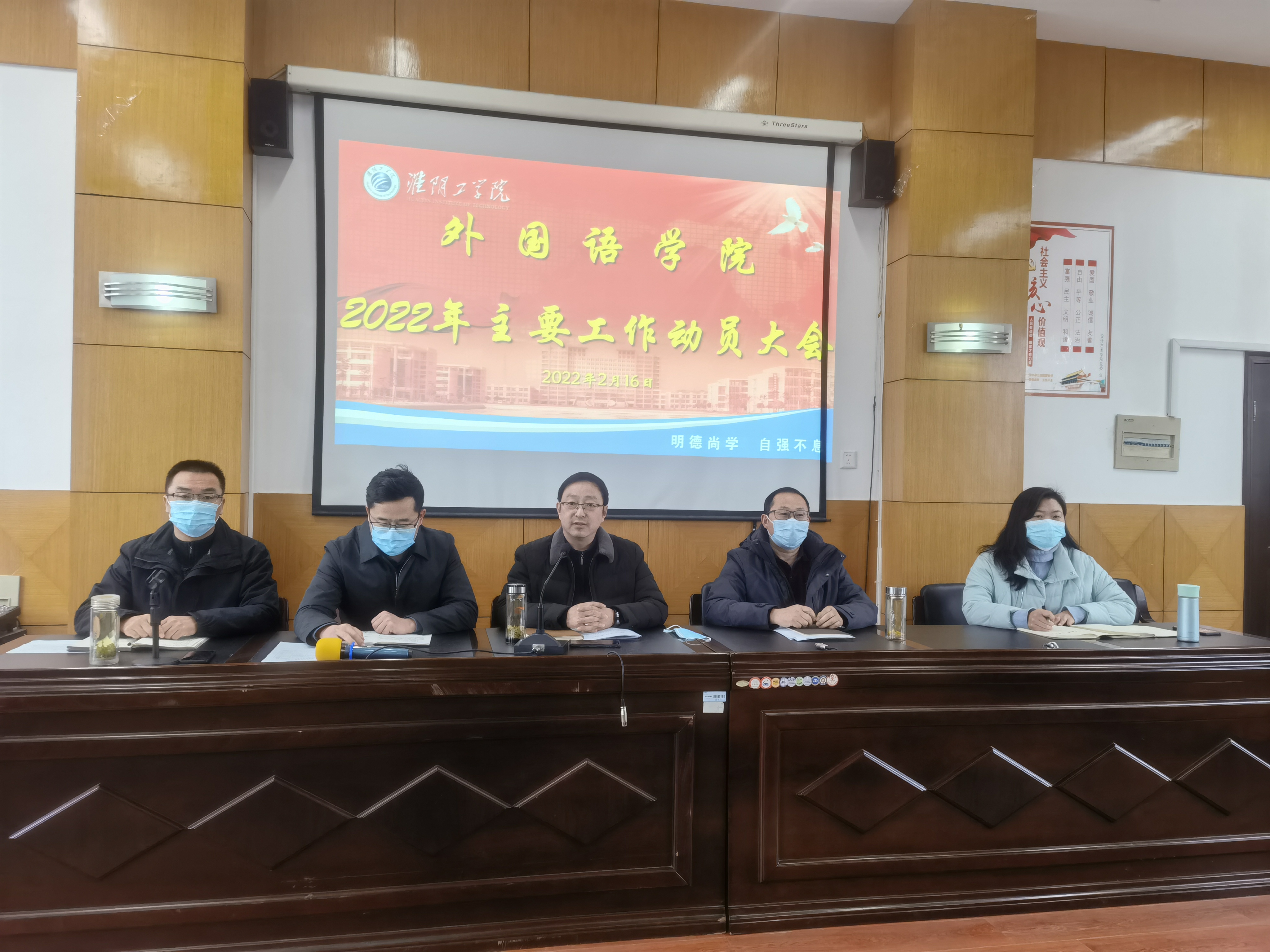 2022年2月16日下午,外国语学院在学院报告厅召开了2022年主要工作动员大会。会议由孙建光院长主持,外院领导班子和全体教职工参会。
