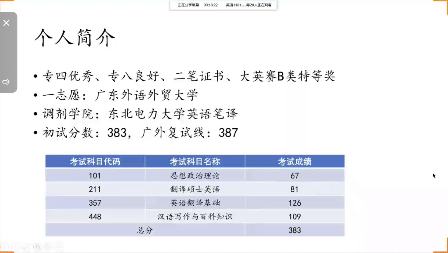 线上会议中,赵艾婕同学结合自身经验对调剂形势、调剂程序、调剂学校、调剂方向等做了全面系统的讲解。此外,她还强调考研调剂期间也不应忘记准备复试,备考专八。接着,刘成成同学围绕自身调剂过程强调了初试分数的重要性,并且,院校调剂名额有限,要时刻关注调剂信息。同时,赵艾婕和刘成成两位同学还关注到了同学们的心理问题,鼓励同学们要调整好心态,认清自身情况,把握好专业优势和调剂机会,既不能过于担忧又不能松懈,主动搜集学校考研信息,明确目标。会议最后,团委书记夏芸提出相关建议。她表示,考研学子要做好调剂的准备,同时也可以考虑其他发展方向,避免二战。
