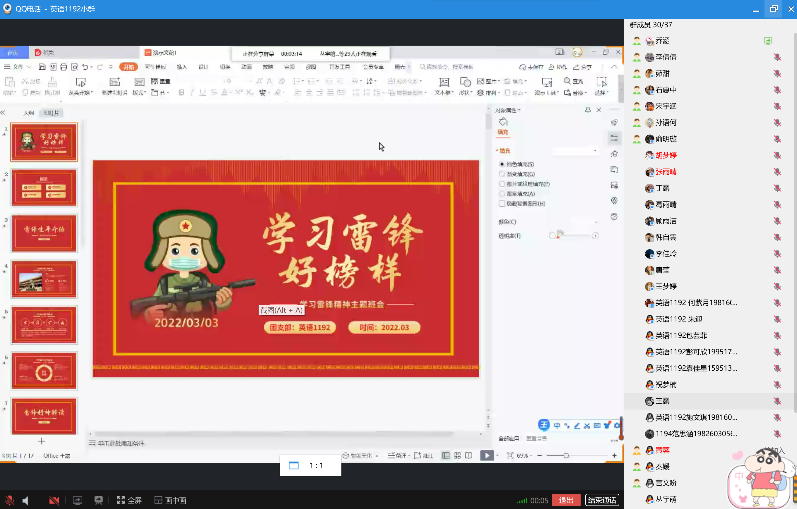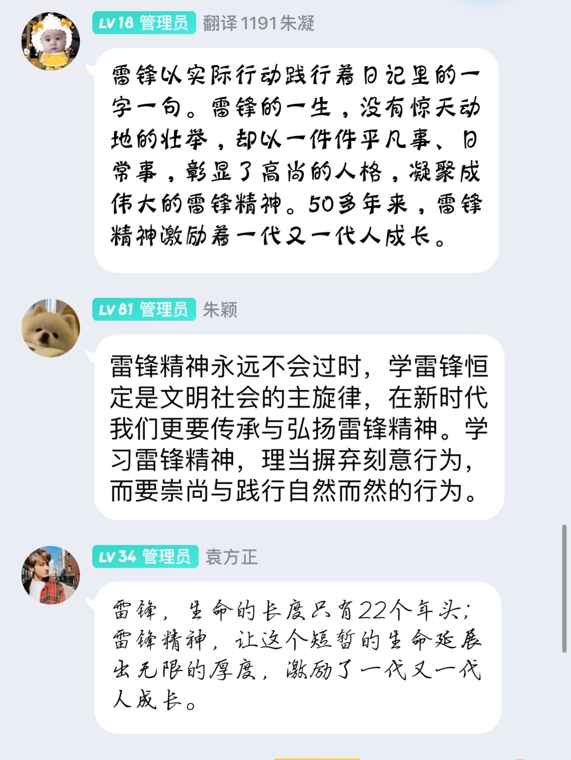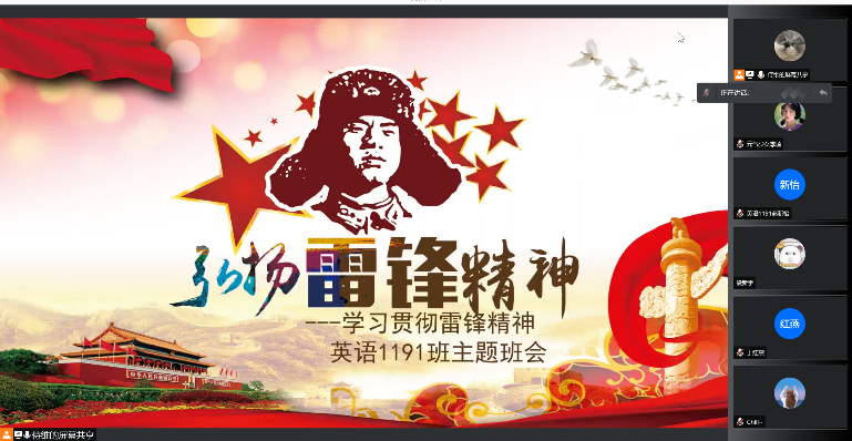 自毛泽东主席于1963年3月5日在⟪人民日报⟫发表“向雷锋同志学习”的题词后,每年的3月5日就被定为学雷锋纪念日。为了学习并传承崇高的雷锋精神,外国语学院各班于3月5日来临之际,纷纷线上召开“学习雷锋精神,弘扬社会主义核心价值观”主题班会。