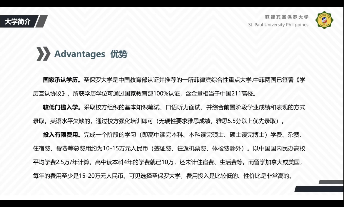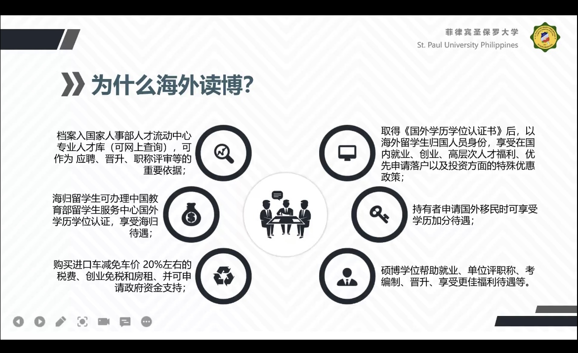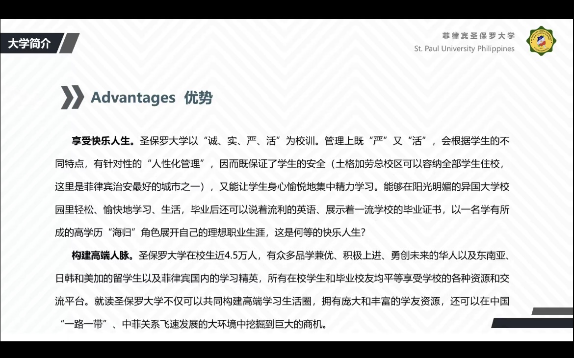 为进一步开阔学生国际视野,增加学生对出国留学的认知,淮阴工学院与菲律宾圣保罗大学于2022年3月16日14:30举办了线上说明交流会(硕博专场)。本次会议由Anna老师主持,圣保罗大学副主任Linda老师担任本次会议主讲人,18级同学参加此次会议。
