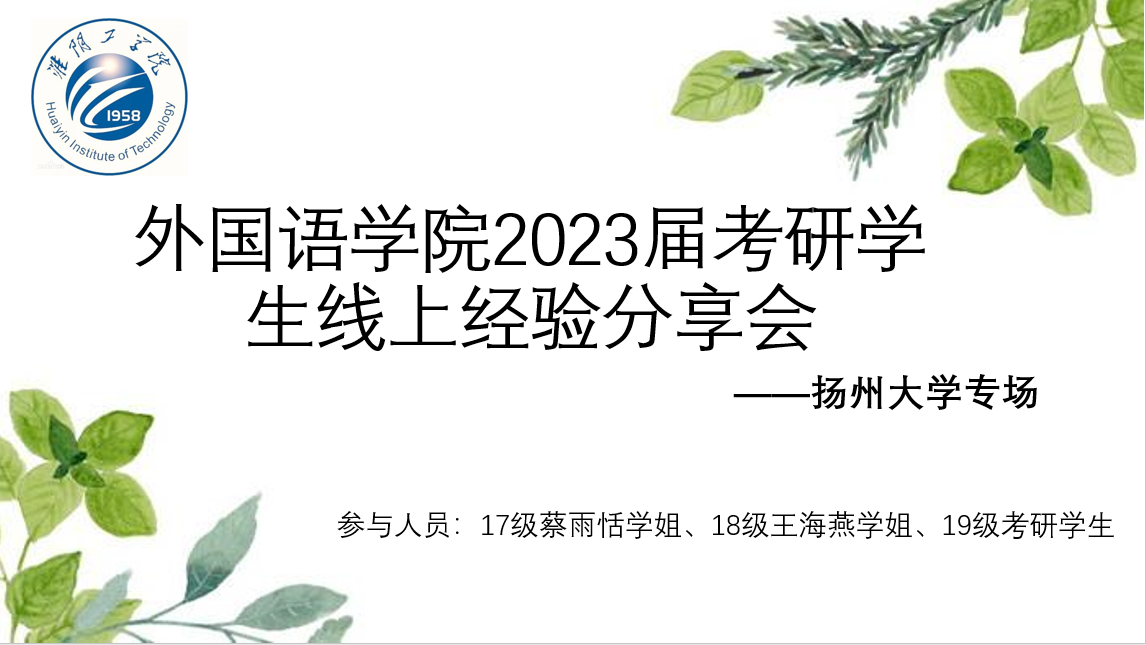为了进一步提高我院学生的考研热情,掌握相关考研技巧,解决在备考中所遇到的疑惑,为考研学生提供一个学习考研经验的平台,帮助他们更好地进入考研状态,为考研打下坚实的基础。6月23日下午,我院通过使用腾讯会议直播的方式,举行2023届考研经验分享会,由考上扬州大学研究生的17级蔡雨恬和18级王海燕为19级考研学生分享经验,2023届全体考研学生参加本次会议。