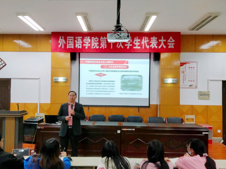 10月13日,外国语学院于品学楼2210开展2022下半年“青马工程培训”第一次课。本次课程主题为《习近平新时代中国特色社会主义思想》,外国语学院院长孙建光担任主讲人,各年级优秀团员参与本次活动。