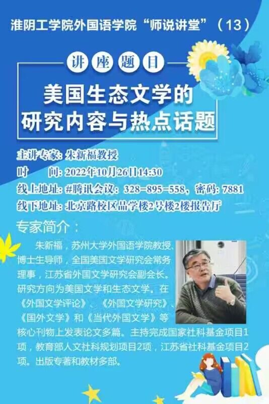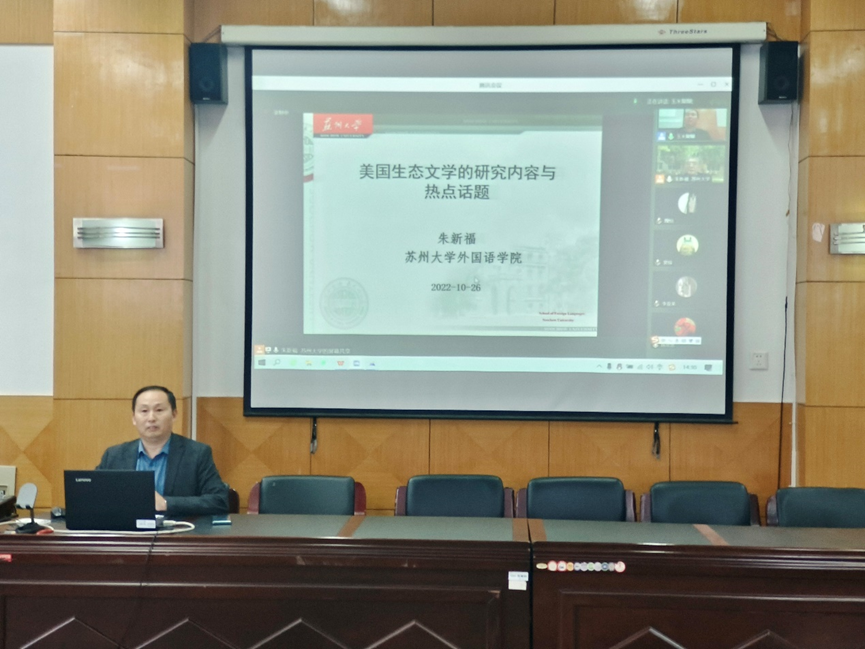 10月26日下午,外国语学院于品学楼2210开展以《美国文学的研究内容和热点话题》为主题的“师说讲堂”第十三期暨学校文科科研能力提升系列活动第三期。本次活动由苏州大学外国语学院朱新福教授担任主讲嘉宾,外国语学院院长孙建光主持。讲座采用线上和线下相结合的方式进行,外国语学院全体教师及其他文科院系教师参加讲座。