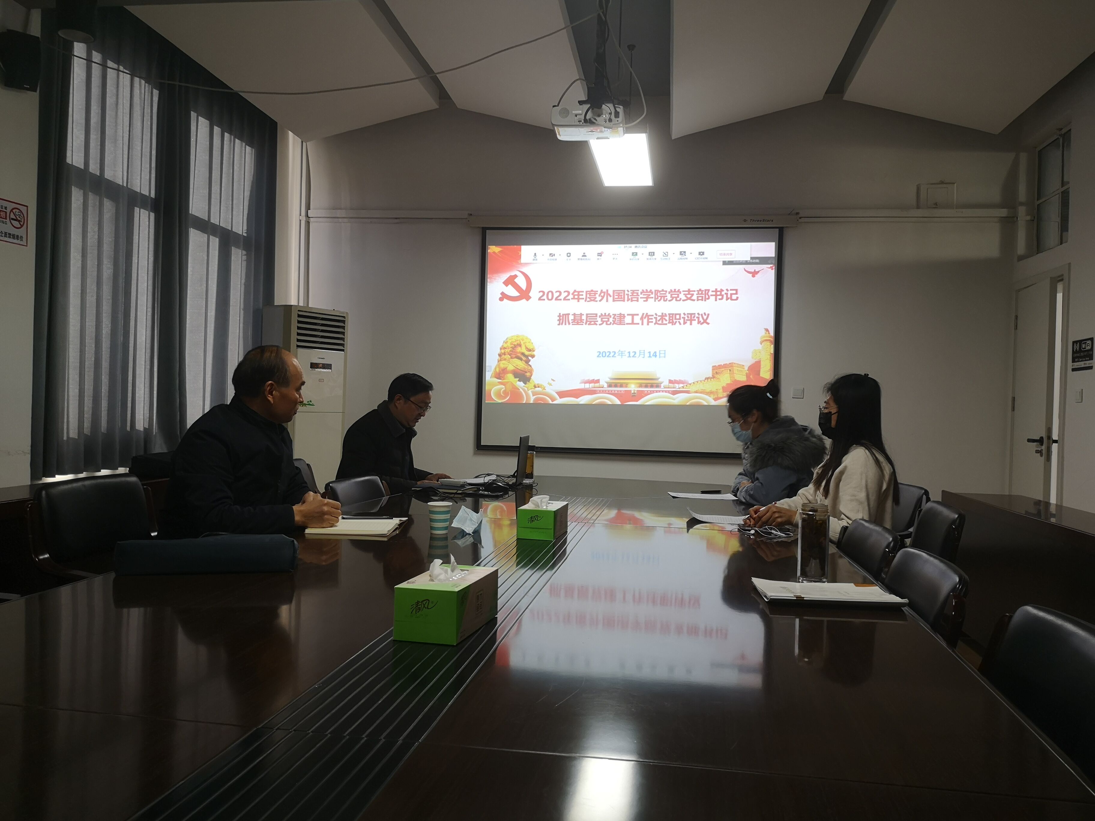 12月14日,外国语学院党委召开2022年度党支部书记述职评议会,本次会议采取线上线下形式。学院领导班子和全体支部书记参加会议,校专职组织员龚卫东到场指导,会议由学院党委书记李炜主持。