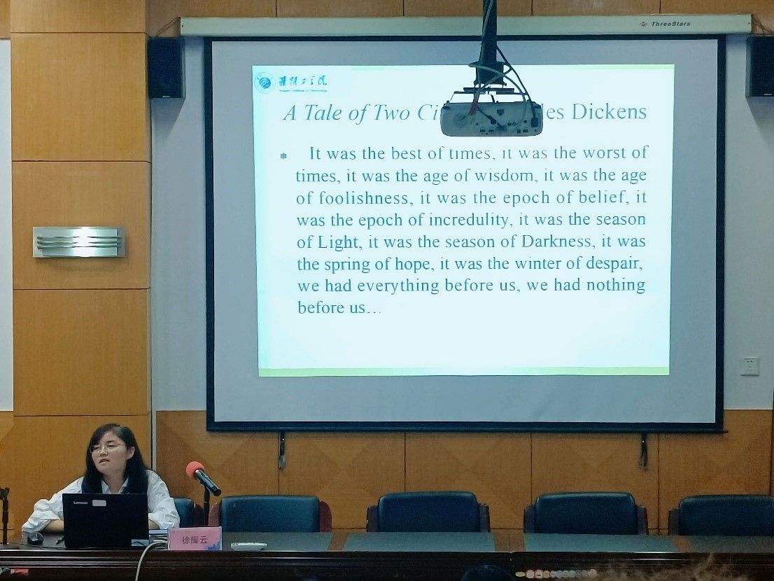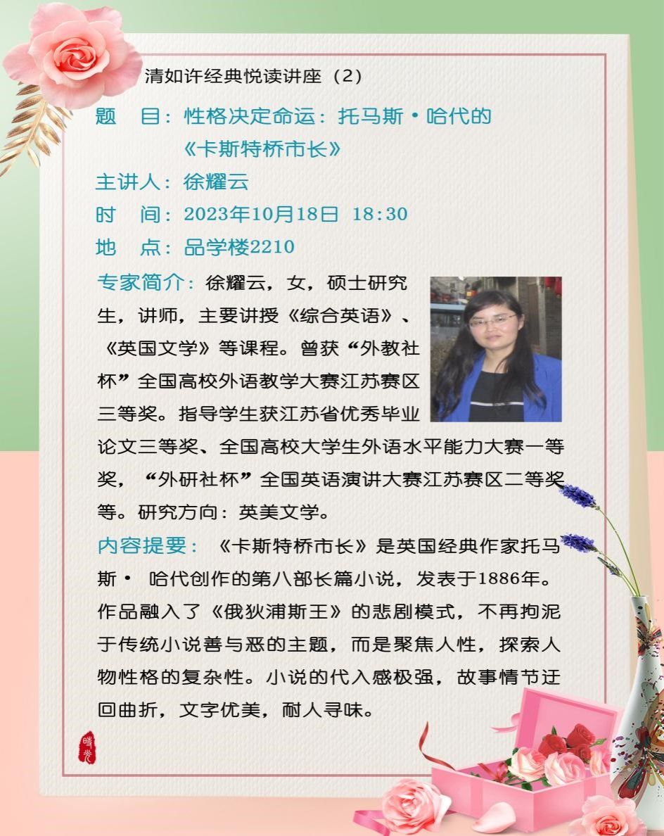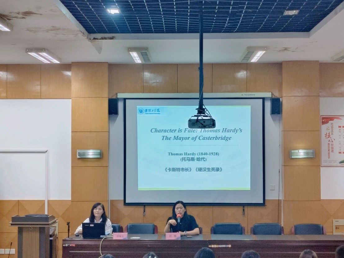 2023年10月18日下午18点30分,外国语学院于品学楼2210报告厅开展了以“性格决定命运:托马斯·哈代的《卡斯特桥市长》”为主题的“清如许”经典悦读讲座第二期。本次讲座邀请外国语学院英语系教师徐耀云担任主讲人,由外国语学院副院长郁敏担任主持,外国语学院全体大一学生参加。