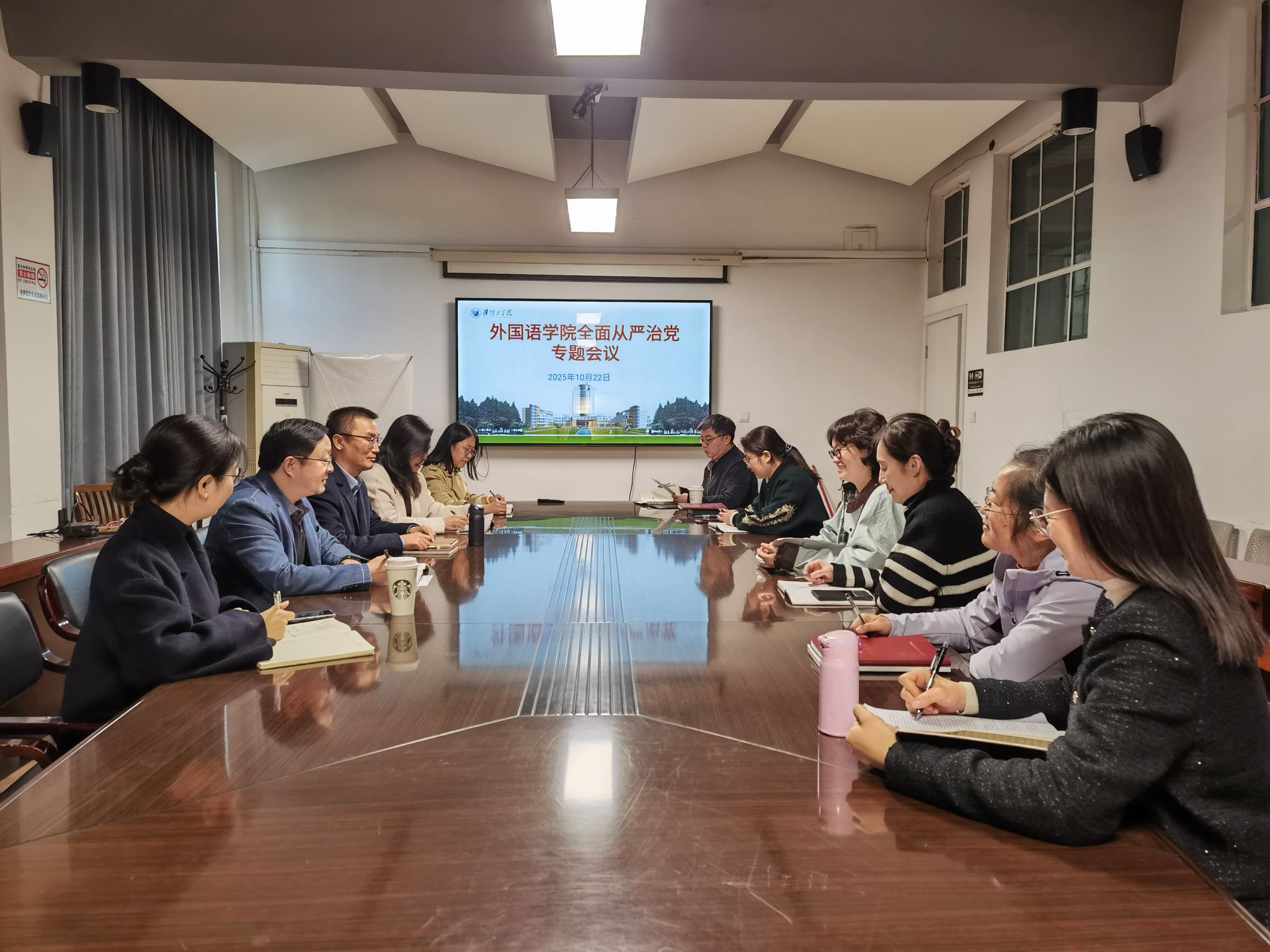 10月22日下午,外国语学院党委召开2025年下半年全面从严治党专题工作会。学院党委理论学习中心组全体成员参加了会议,会议由学院党委书记李炜主持。