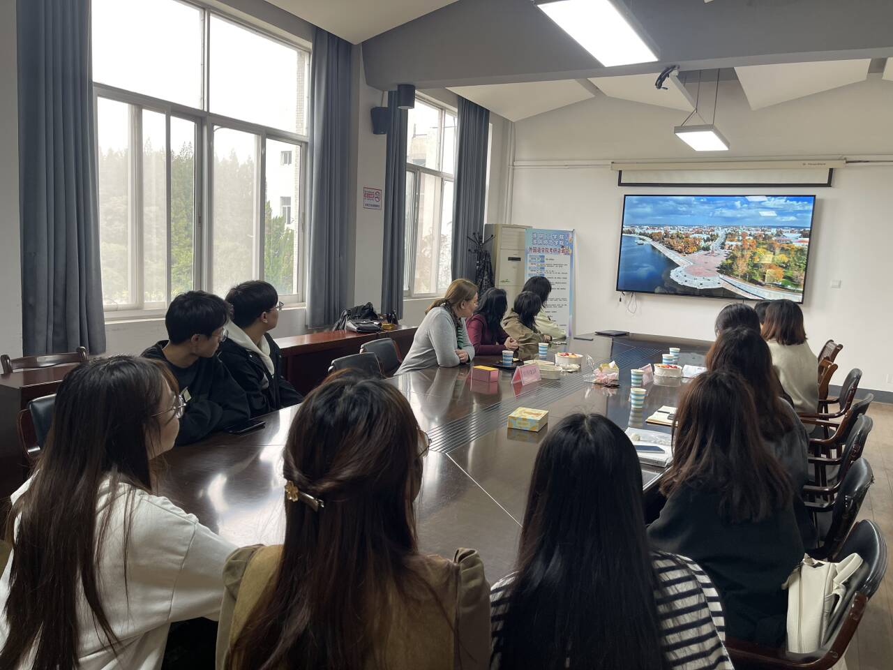 现场播放的宣传片,除宿舍环境外,还展示了对外俄语系多媒体教室、语言实验室、校内食堂,以及贝加尔湖周边文化参访场景,让学生直观感知海外学习与生活氛围。俄语系系主任闫静、教师程文强和鞠传亚参加了本次交流会,鞠传亚老师全程提供翻译支持。