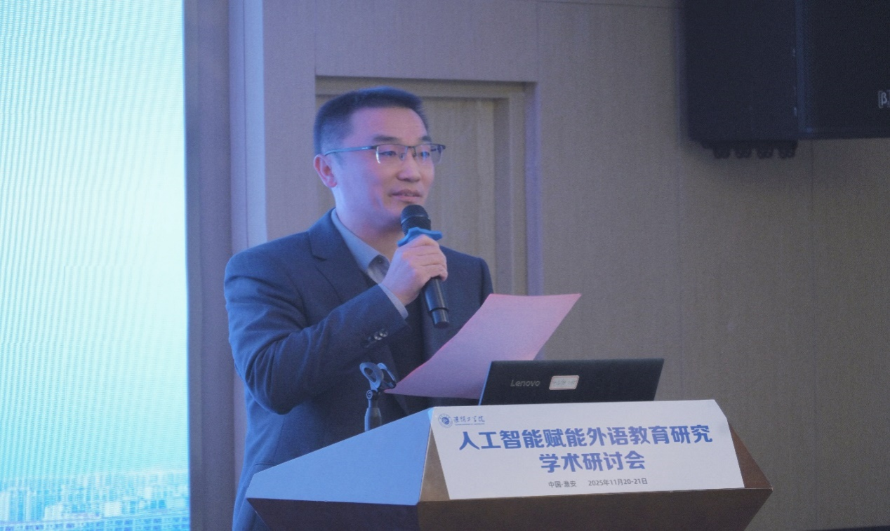 科学技术处副处长刘宇翼代表学校致辞。他指出,作为一所应用型本科高校,淮阴工学院近年来在学科发展、师资队伍建设与人才培养等方面取得了显著成效,社会影响力不断提升。他强调,本次研讨会是学校外语学科面向未来发展的重要起点,期待与会嘉宾共同擘画人工智能时代外语教育的崭新蓝图,并预祝本次研讨会取得圆满成功。