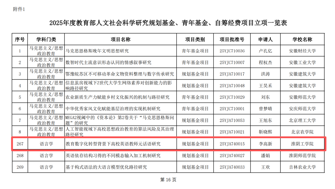 近日,教育部社会科学司正式公布2025年度教育部人文社会科学研究项目立项结果,我院李高新博士申报的课题《教育数字化转型背景下高校英语教师元话语研究》成功获批规划基金项目立项。这是我院在英语教育与数字化交叉研究领域取得的重要突破,充分彰显了学院在外国语言文学学科与教育现代化融合发展中的科研实力。