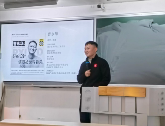 为更好地凝聚校友力量,加强校友与母校之间的联系,发挥优秀校友榜样引领作用,2025年11月19日,设计艺术学院在萧3209举办主题为“好的设计值得被世界看见”的优秀校友讲座。此次讲座邀请2015届工业设计专业校友、淮安品向智能制造有限公司设计总监曹永华主讲,讲座由学院党委副书记、副院长景有荣主持,2025级新生参加了讲座。