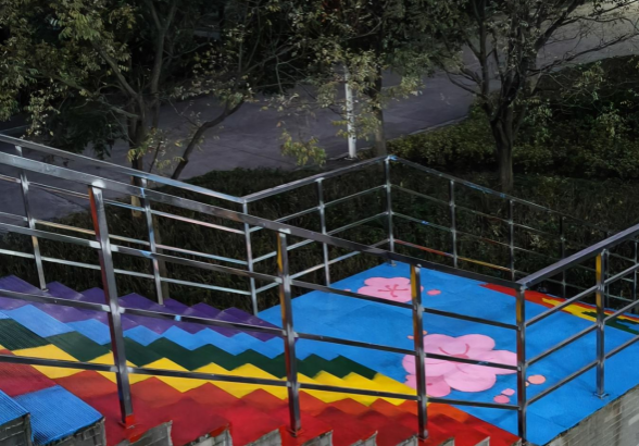 笔触流转间,楼梯通道、台阶墙面等原本单调的区域焕然一新,每一抹色彩都传递奋进力量,使基地成为主题鲜明、富有感染力的“沉浸式创新打卡点”。