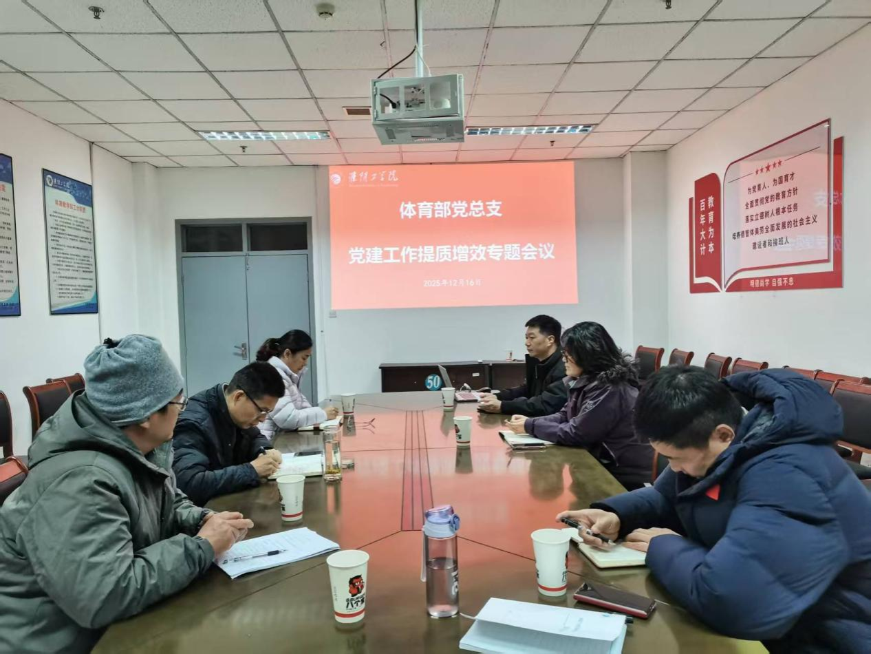 12月16日下午,体育部党总支在体育馆110会议室召开党建工作提质增效专题会,电信学院党委书记韩飞作党建工作模式专题培训。党总支书记李雪红主持会议,全体总支委员参加会议。