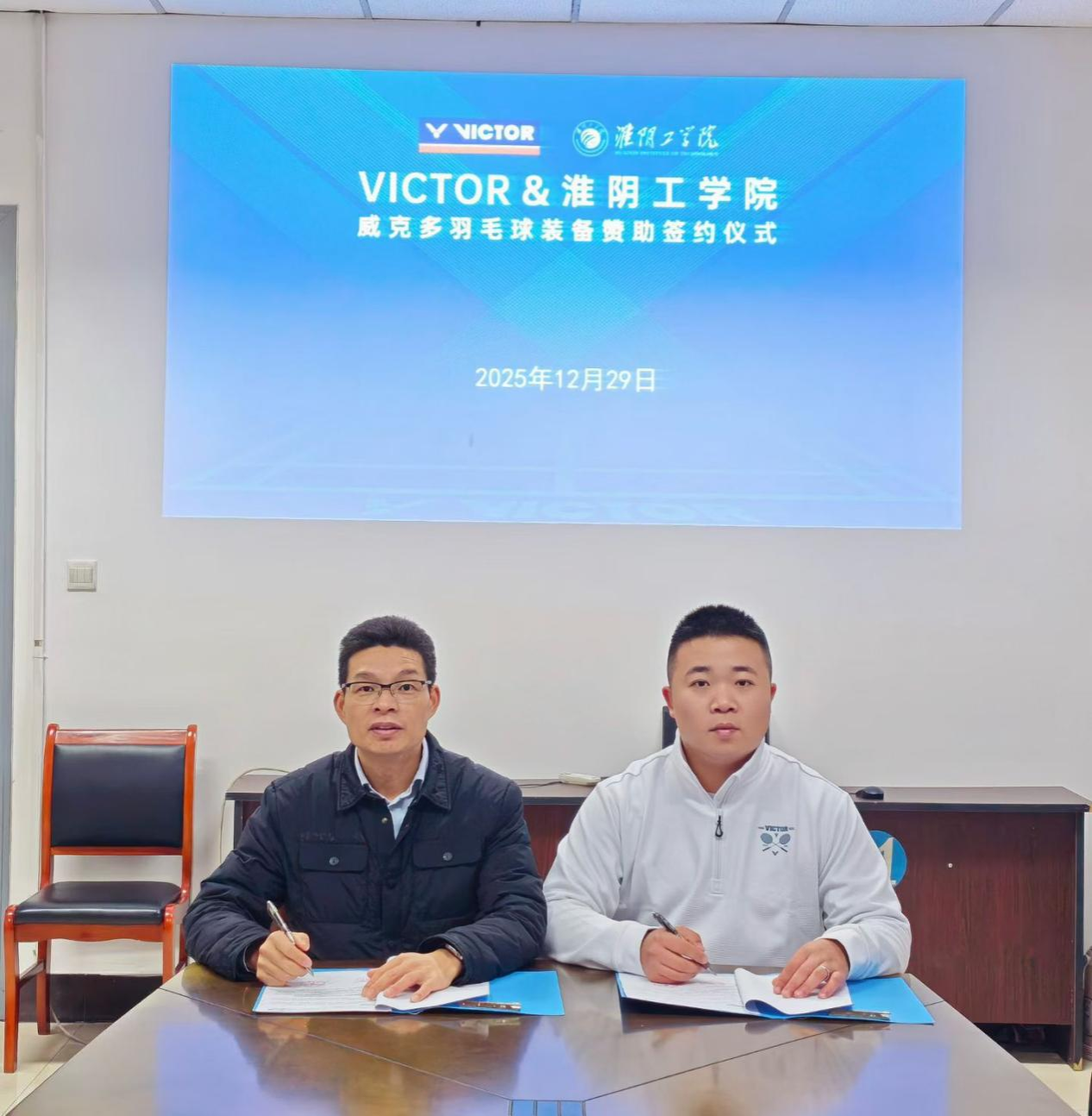 12月29日下午,我校羽毛球队与威克多体育用品有限公司(VICTOR)在南园体育馆会议室隆重举行羽毛球装备赞助签约仪式。体育部主任王冬、校羽毛球队教练员王欣及全体队员与威克多负责人出席仪式,现场气氛庄重热烈,彰显出双方对此次合作的高度关注,并对其前景寄予了深切的美好期许。