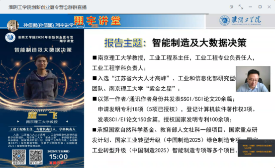 7月23日下午,淮阴工学院2020年大学生创新创业夏令营翔宇讲堂第二场专家报告在逸夫楼路演厅开讲。南京理工大学教授,工业工程系主任,工业工程专业负责人,工业工程学科负责人童一飞教授作了题为“智能制造及大数据决策”的学术报告。本场报告会由创新创业学院院长助理余柏林主持,通过钉钉群直播的方式开展。全校1324名师生参加了本场报告会。